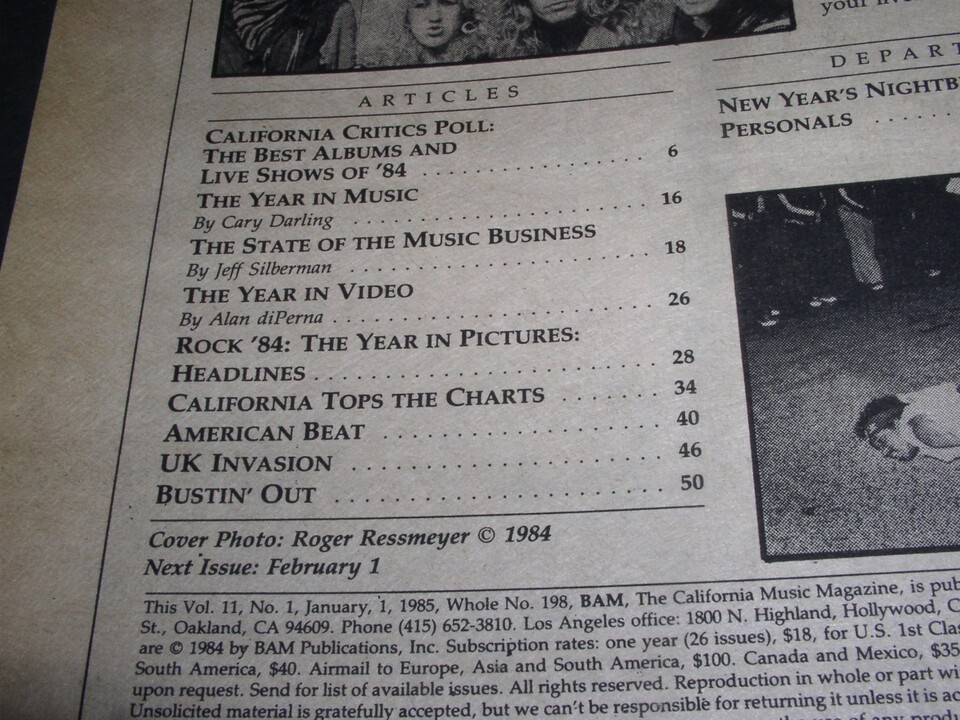 Huey Lewis BAM Magazine Vintage 1985 California Critics Poll Year In Music Video