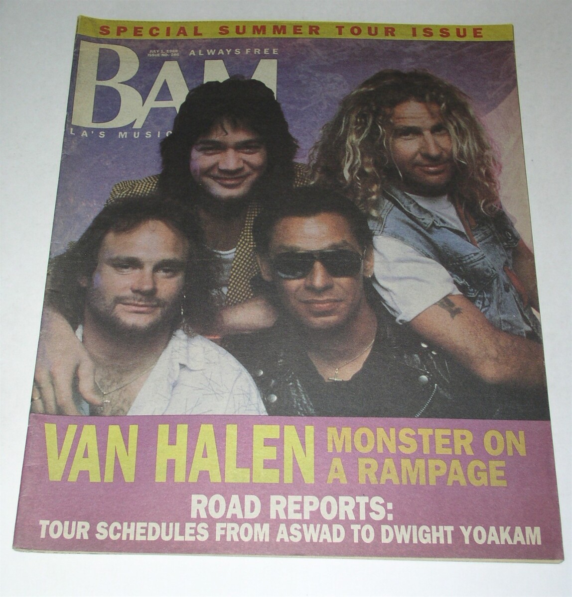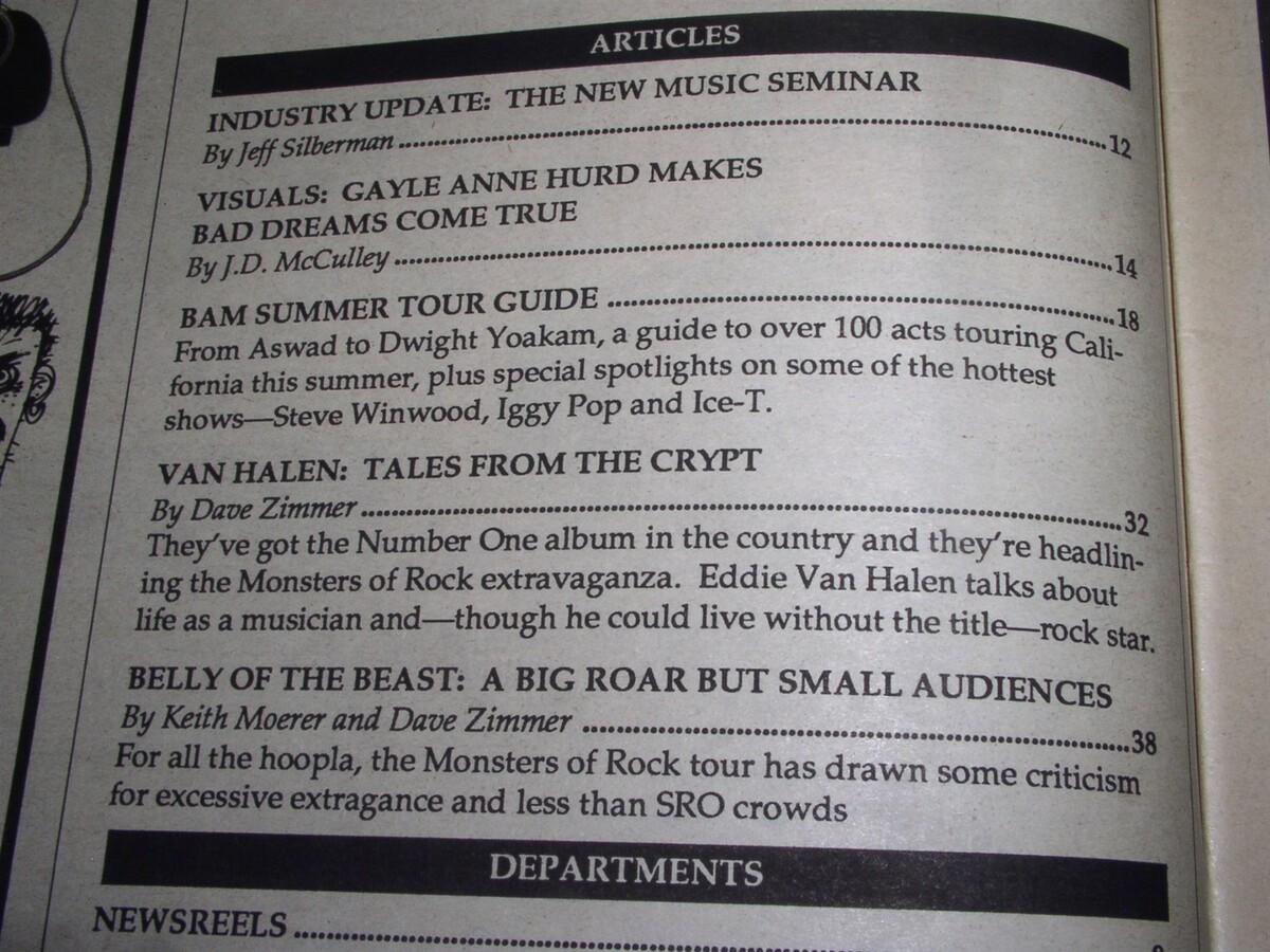 This is the July 1, 1988 issue of "BAM" magazine. Cover story on Van Halen. Inside: Gayle Anne Hurd, BAM Summer Tour Guide, Belly Of The Beast: A Big Roar But Small Audiences. A terrific item for the fan or collector.