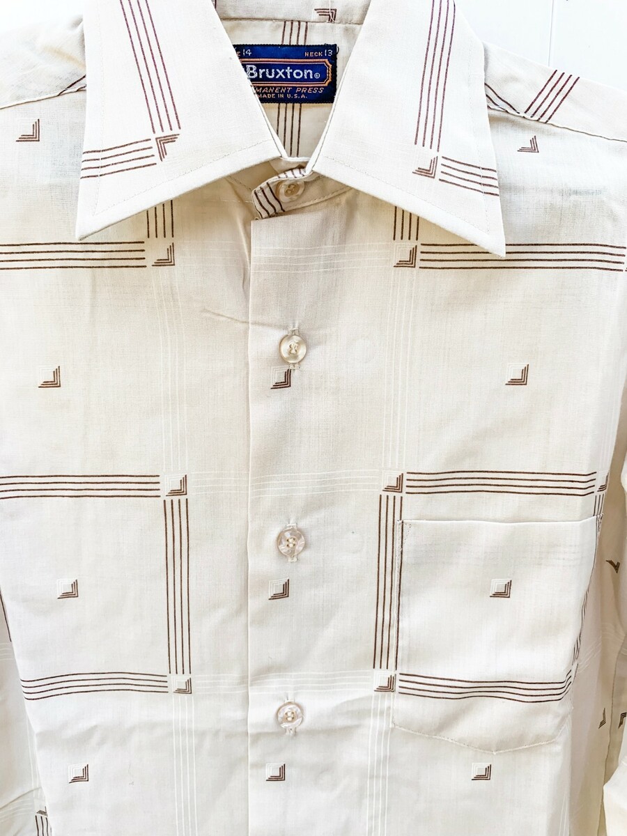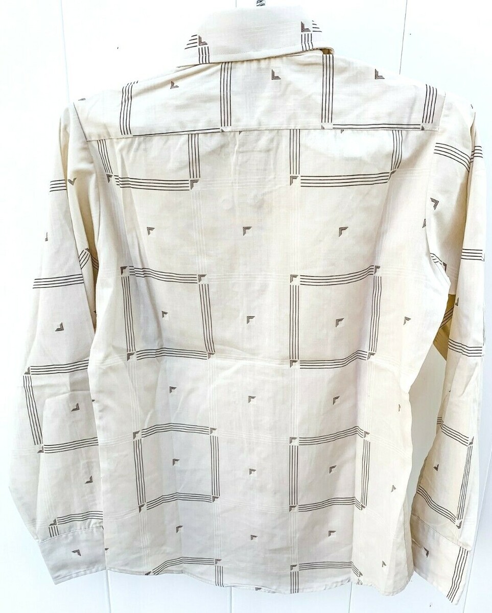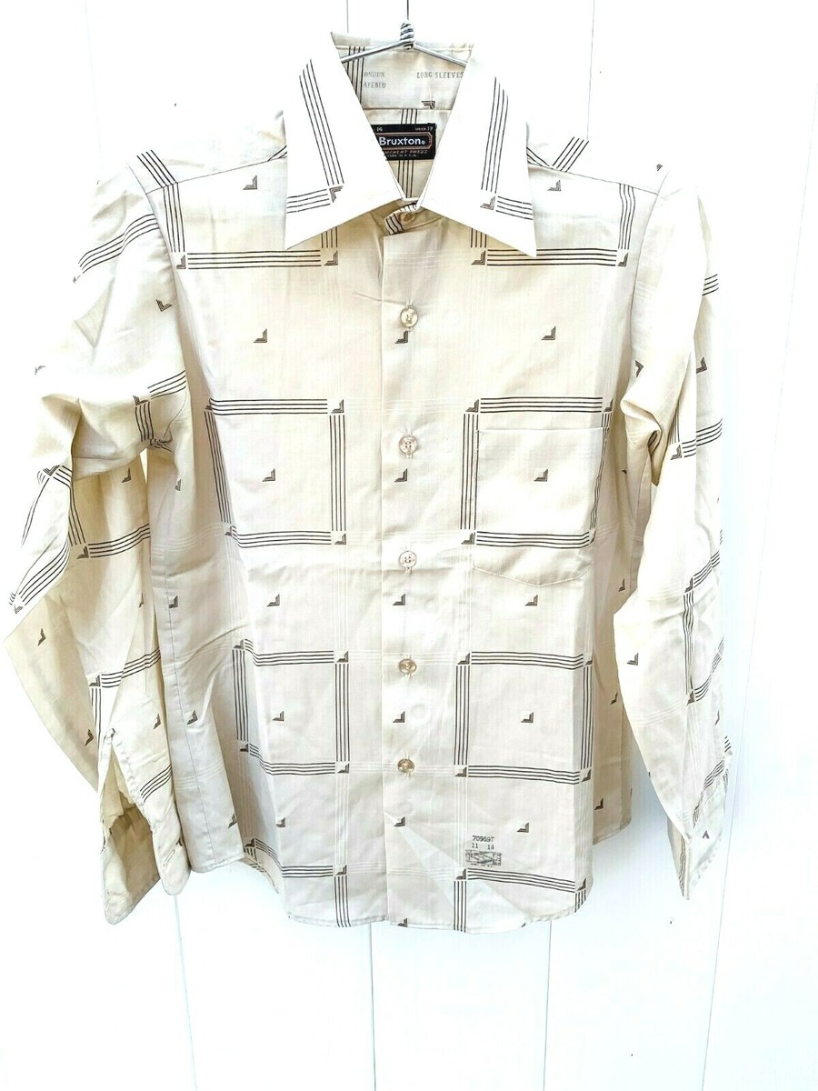 VTG 70s Bruxton Disco Print Shirt Tan Brown Mod Squares Cotton Blend NOS 36 Ches