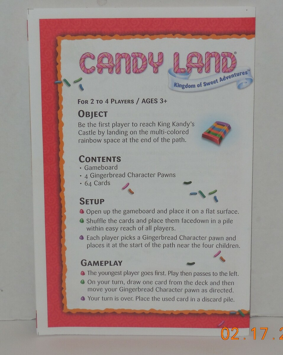 For Sale is a 2010 Milton Bradley MB Candy land Replacement Instruction Sheet. This listing is for the Replacement Instruction Sheet ONLY. it in good Used condition as seen in the pictures provided what you see is what you will receive. Please ask Any and All Questions prior to purchasing. Fast Same or Next day shipping with Free Delivery Confirmation within the U.S. Payment Due within 7 days of purchase (if you need more time please let us know In advance) we love to combine shipping is always a Yes and Most of the time Additional Items Ship for free.