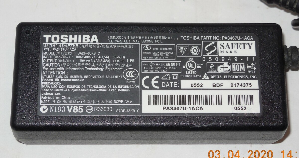 for sale is for a Toshiba Power adapter SADP-65KB C Laptop Battery Charger Input 100-240v Output 19v OEM Replacement. Tested and Works. this listing is ONLY for the part that is pictured. Please see pictures prior to purchasing. Please ask any and all questions prior to purchase. Fast same or next day shipping with Delivery Confirmation.