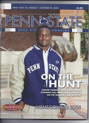 For Sale is a rare and hard to find vintage 2005 Penn State Football Program October 29th vs Purdue. its In good USED Condition as pictured. no rips tears or writing in or on the program but does have some minor handling wear. would make a wonderful additioon to any sports memorabilia collection. Please ask Any and All Questions prior to purchasing. Fast Same or Next day shipping with Free Delivery Confirmation within the U.S. Payment Due within 7 days of purchase (if you need more time please let us know In advance) we love to combine shipping is always a Yes and Most of the time Additional Items Ship for free.