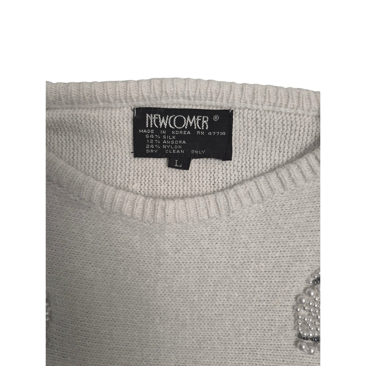 VTG 80s Newcomer Beaded Shoulder Sweater Off White Silk Angora Sz L 44 Bust