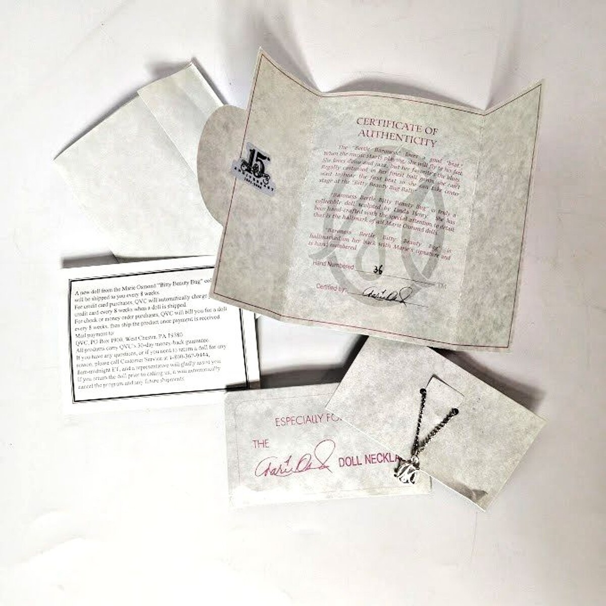 This listing is for a lot of four miniaturized porcelain dolls from the Marie Osmond Dolls collection. Each doll is part of the Bitty Beauty Bug series, measuring 6 inches in size. These collectible dolls feature bug characters and were parts of a subscription purchase from QVC. Perfect for doll collectors or display enthusiasts, these unique and charming dolls are sure to add a touch of nostalgia and whimsy to any collection. Their names are Queen Bee, Countess Caterpillar, Baroness Van Beatle, and Count Cocky Roach. Very cute dolls in very good condition. Boxes do have age and shelf wear. 3 Have certificates and necklaces. Cockey Roach does not have his. These are not toys are not recommended (per box) for children under age 6.