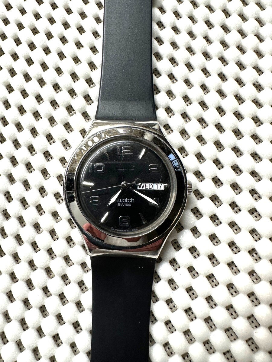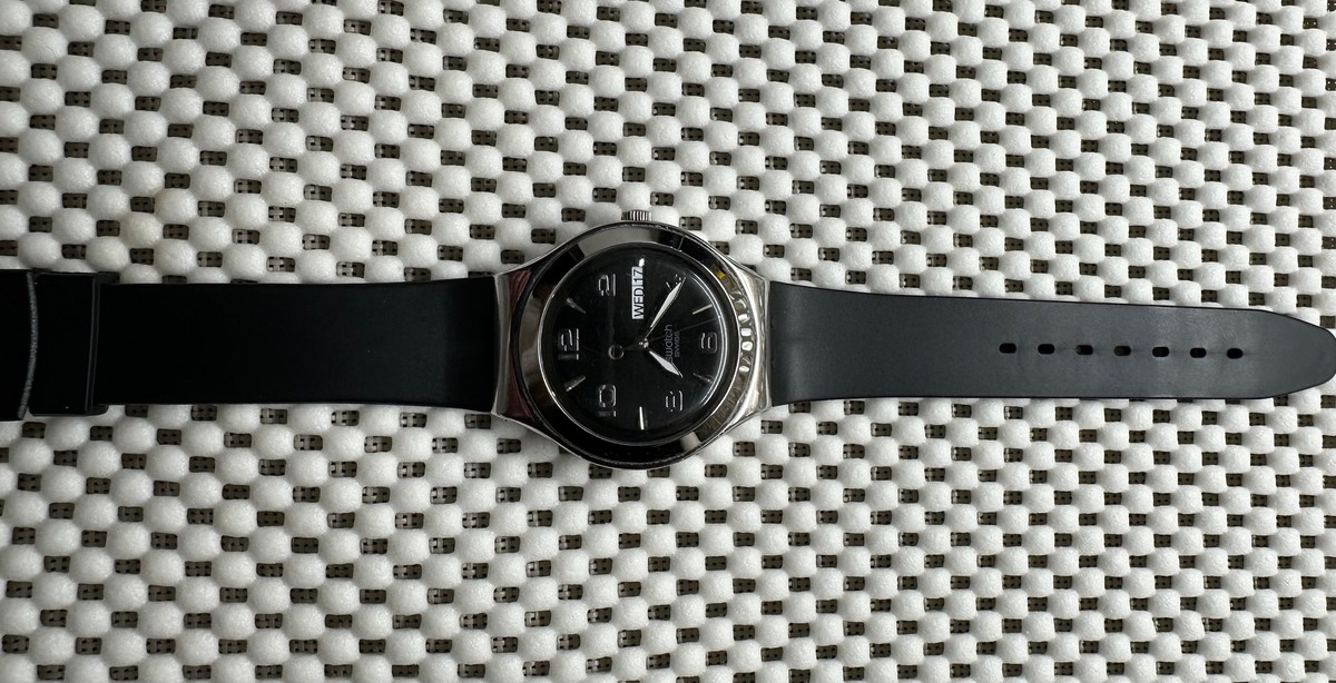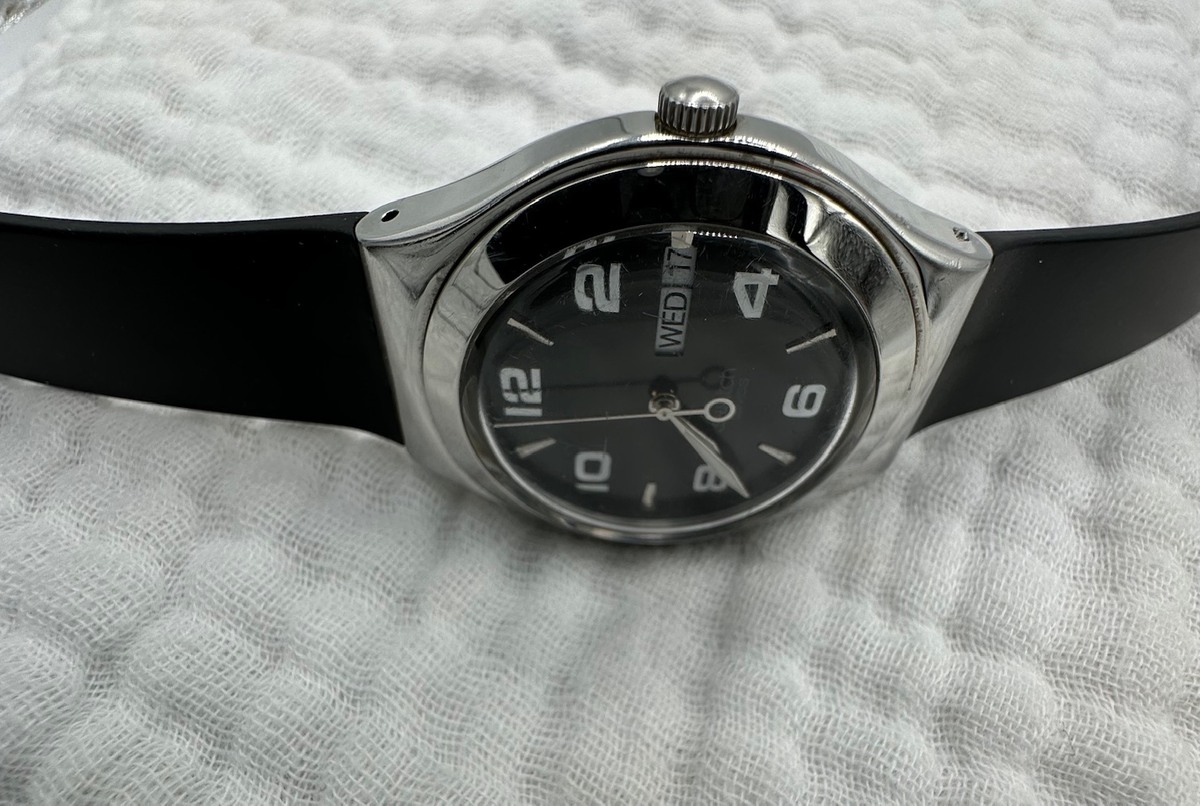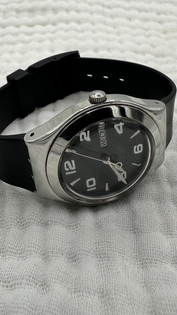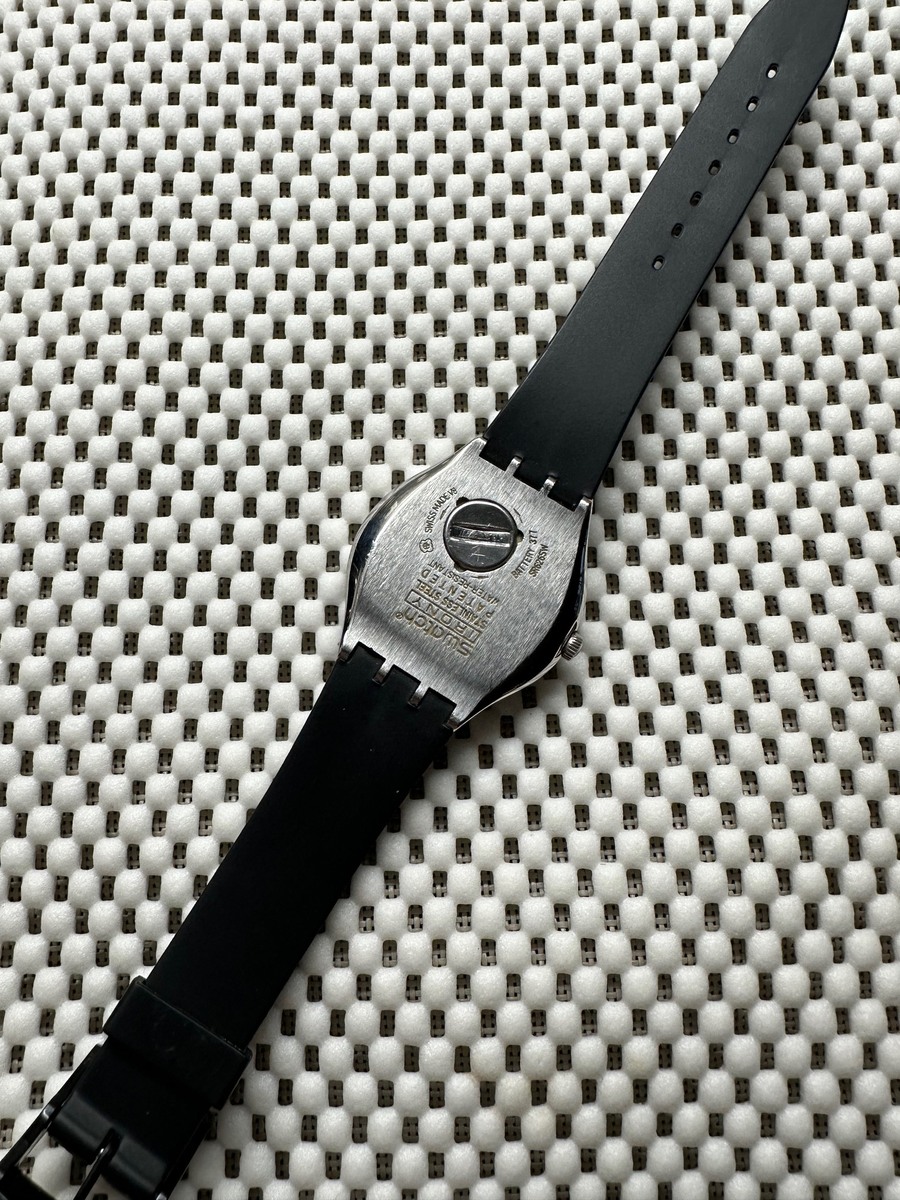 Who needs leather or lace when you have this preloved Swatch Feature Steel timepiece?