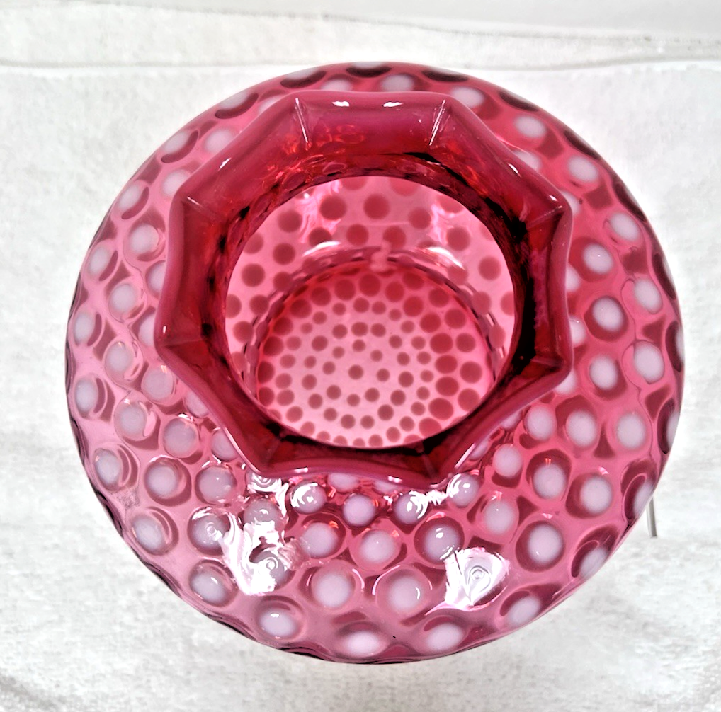 Vintage Cranberry White Glass Coin Dot Ruffled Top Vase 6 1/4 Wide 4 inch Tall We believe this is Fenton but no tag so unsure In great shape no chips or cracks