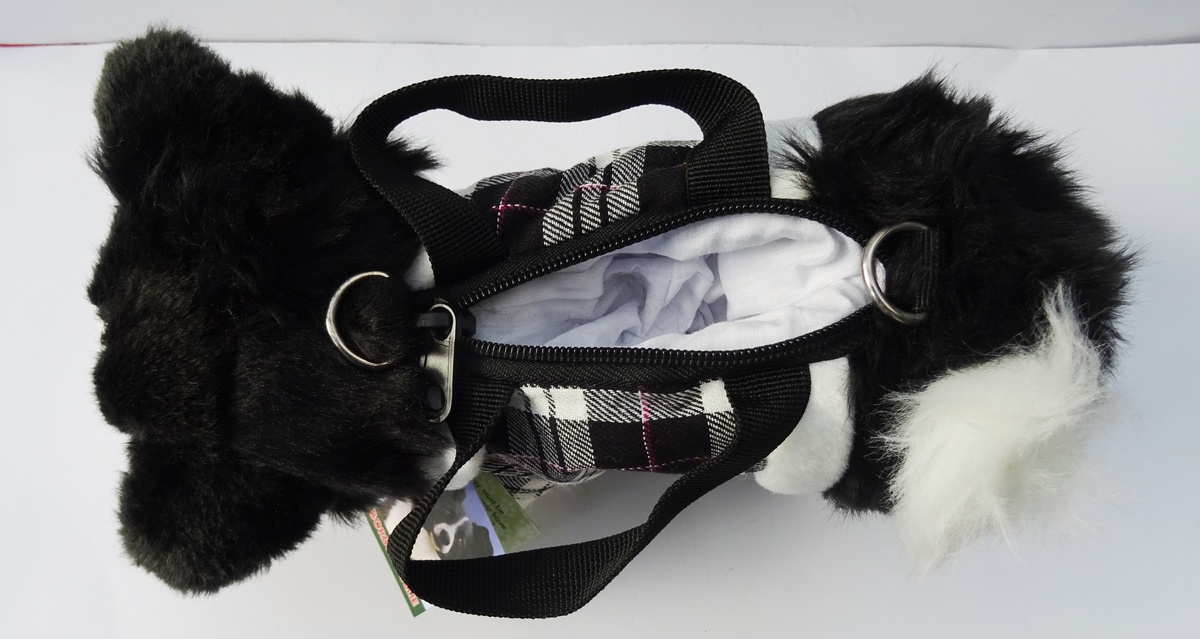 Border Collie shaped shoulder or hand bag fitted with a tartan coat