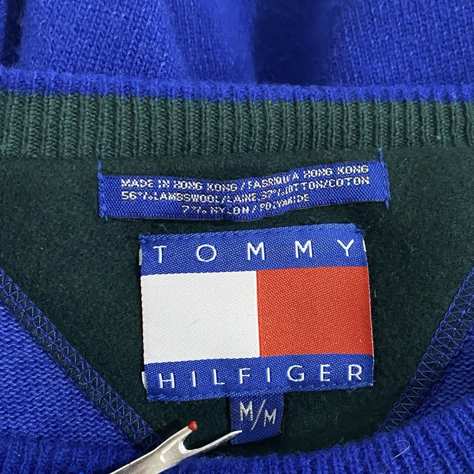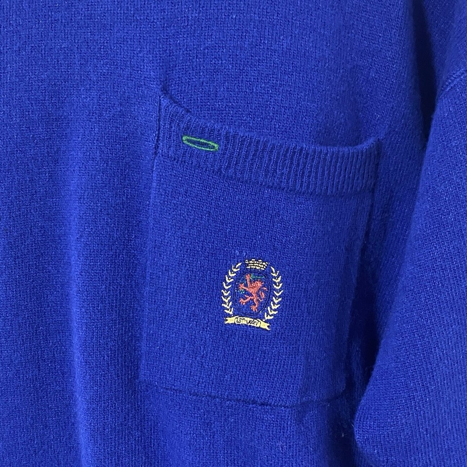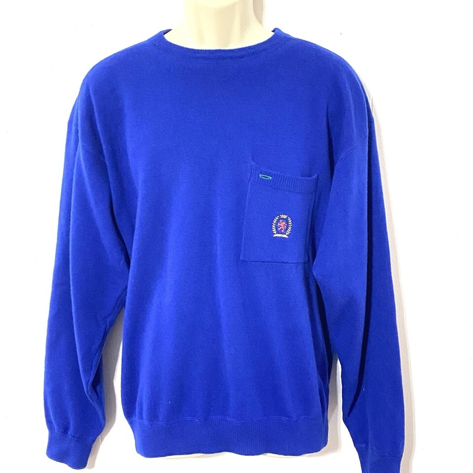 Vtg Tommy Hilfiger CREST Logo M Lambswool WOOL Blend POCKET Sweater ROYAL BLUE
