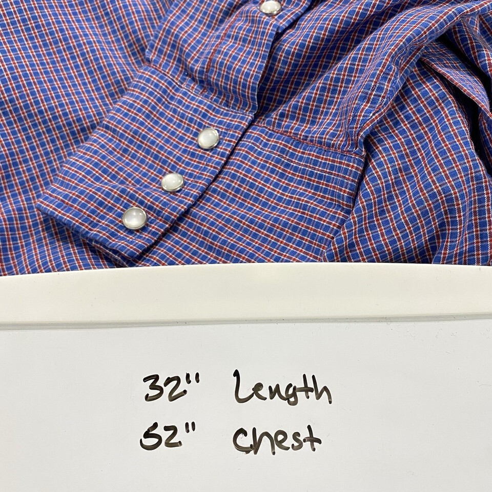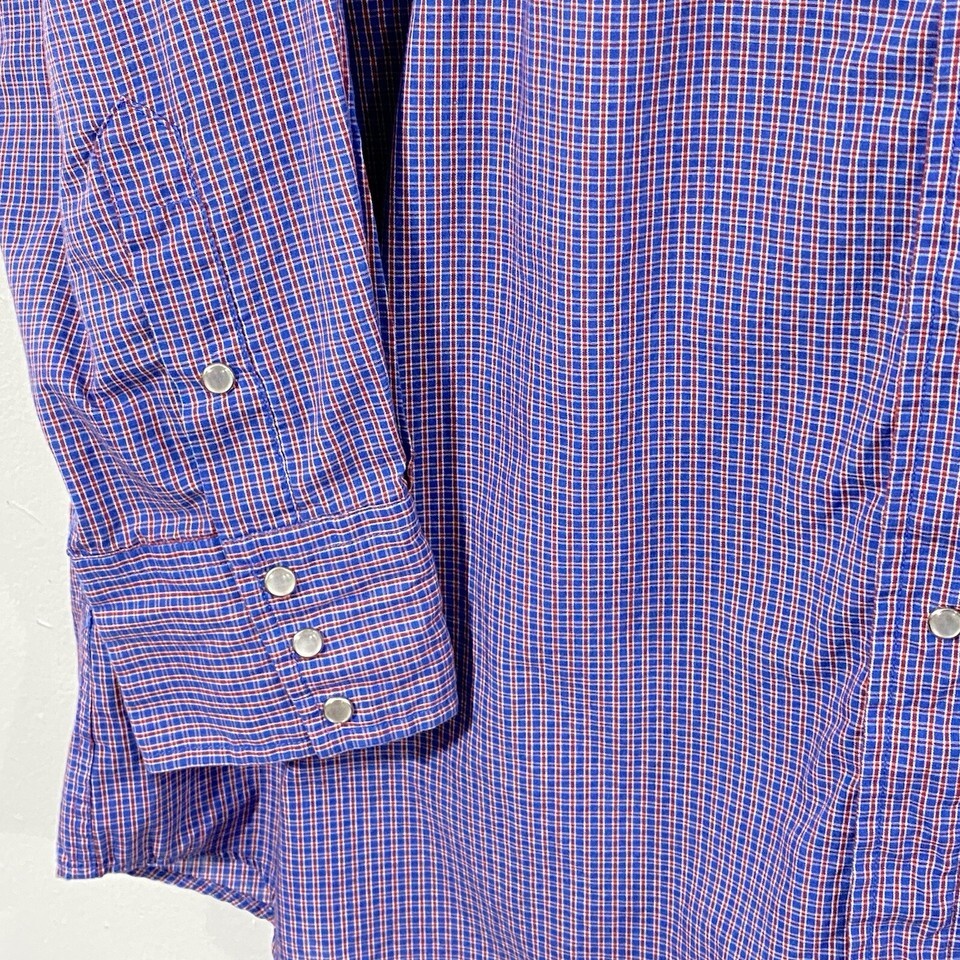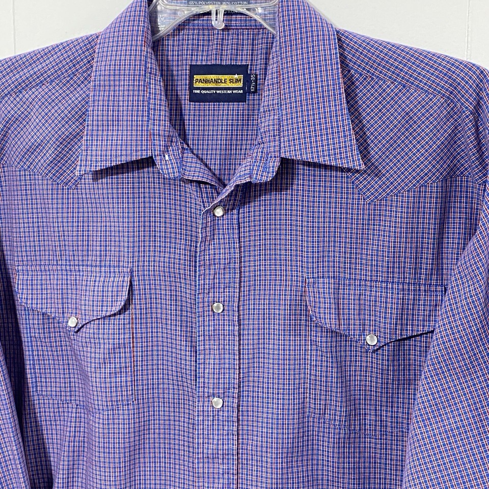 Vintage PANHANDLE SLIM Pearl Snap Shirt Men 17.5/35 Red Blue Plaid Western USA