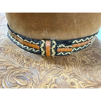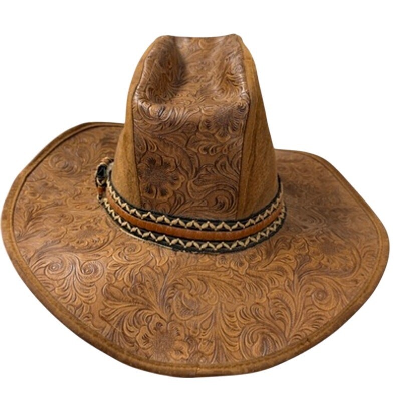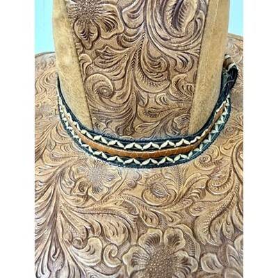 This exquisite vintage cowboy hat is crafted from richly tooled floral leather with a sculptural 6?7" crown and wide 15" brim. Its deep caramel brown hue, embossed scrollwork, and braided hatband evoke classic Americana?ideal for collectors, costumers, and Western style lovers. Beautifully made and Made in USA.