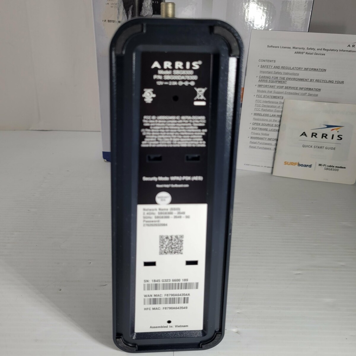 Already factory reset. The ARRIS Surfboard Docsis 3.1 Gigabit Cable Modem Plus AC2350 WiFi Router is a high-speed modem and router combo designed for gaming and other bandwidth-intensive tasks. With a maximum downstream data rate of 10 Gbps and a maximum wireless data rate of 2350 Mbps, this modem provides incredibly fast connectivity for your PC and other devices. It also features multiple LAN ports and supports various networking standards, making it a versatile and reliable option for home networking needs.