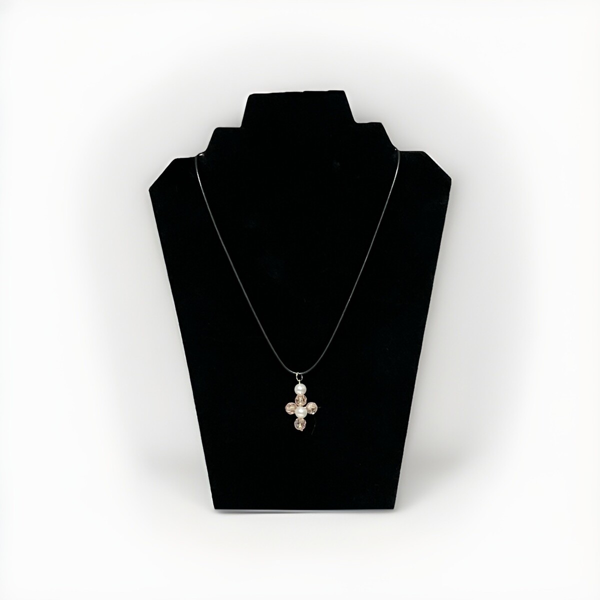 Pendant Pink And White Beaded Cross On Black Leather Cord Handmade