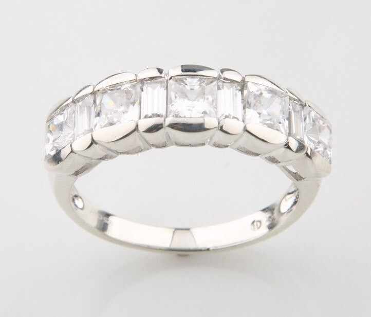 Features: Sterling silver band ring, with nine cubic zirconia stones