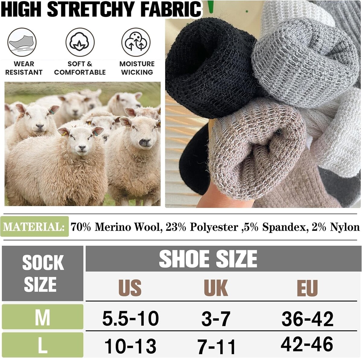 Merino Wool: Crafted from a blend of 70% Merino wool, 23% polyester, 5% spandex, and 2% nylon, these socks retain warmth while keeping your feet cozy on chilly days.