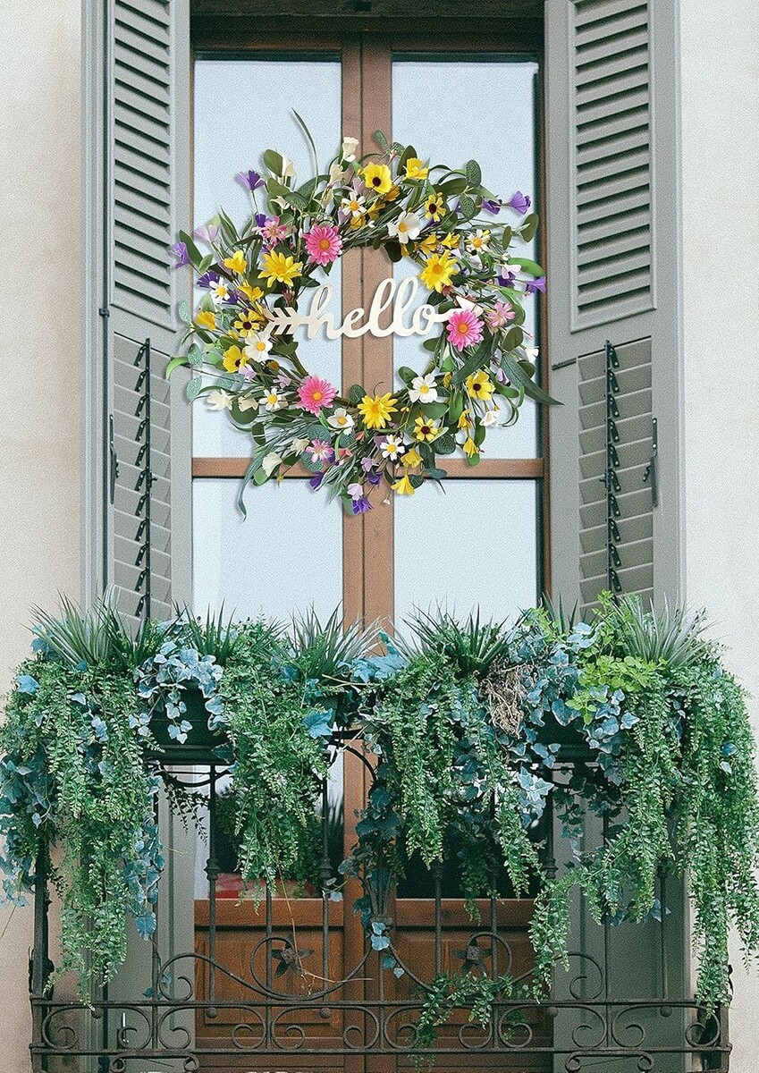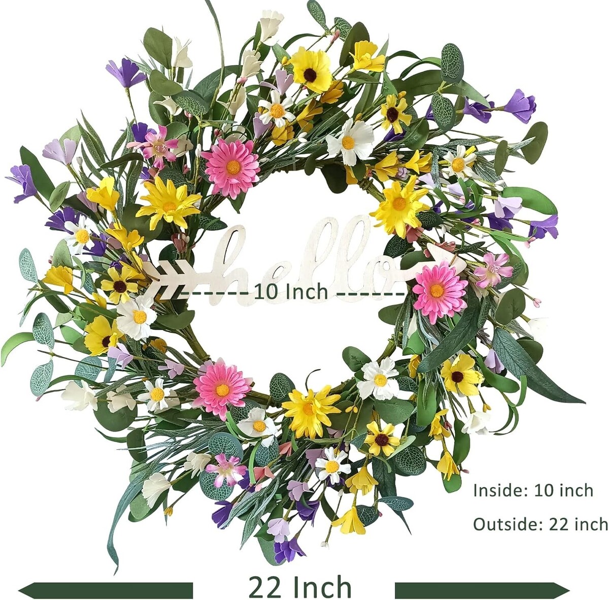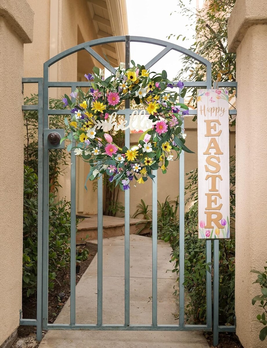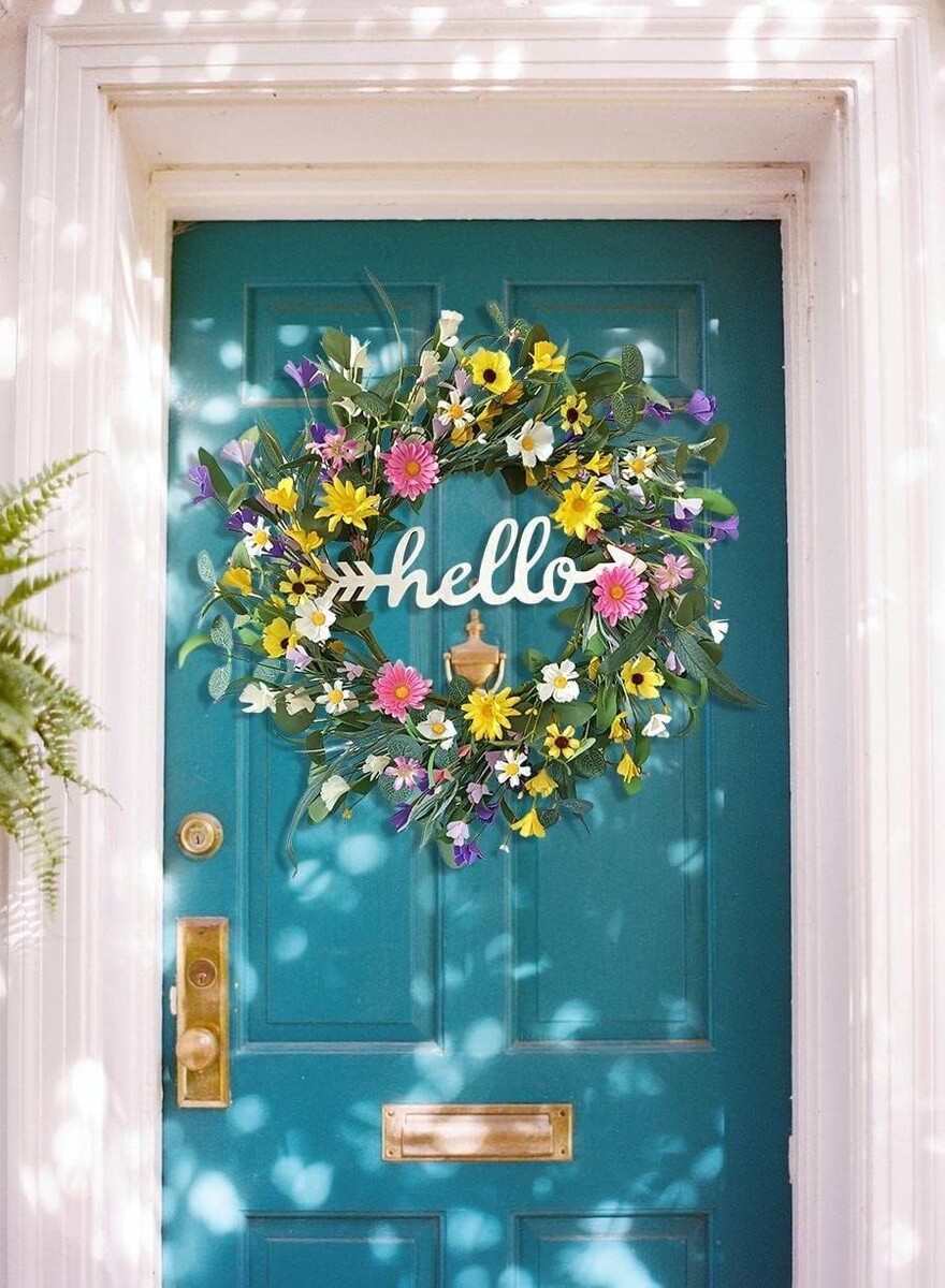 Vibrant 22-Inch Spring Wreath for Front Door with Hello Sign ? Farmhouse Decor