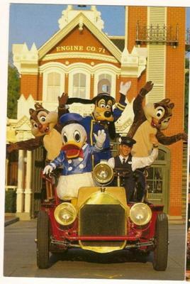 Get ready for a joyful ride down memory lane with this delightful vintage postcard from Walt Disney World's Magic Kingdom! This vibrant card captures a fantastic moment on Main Street U.S.A., featuring beloved Disney characters Mickey Mouse, Donald Duck, Goofy, Chip, and Dale all waving from a charming vintage car. In the background, the iconic "Engine Co. 71" building adds to the nostalgic atmosphere.