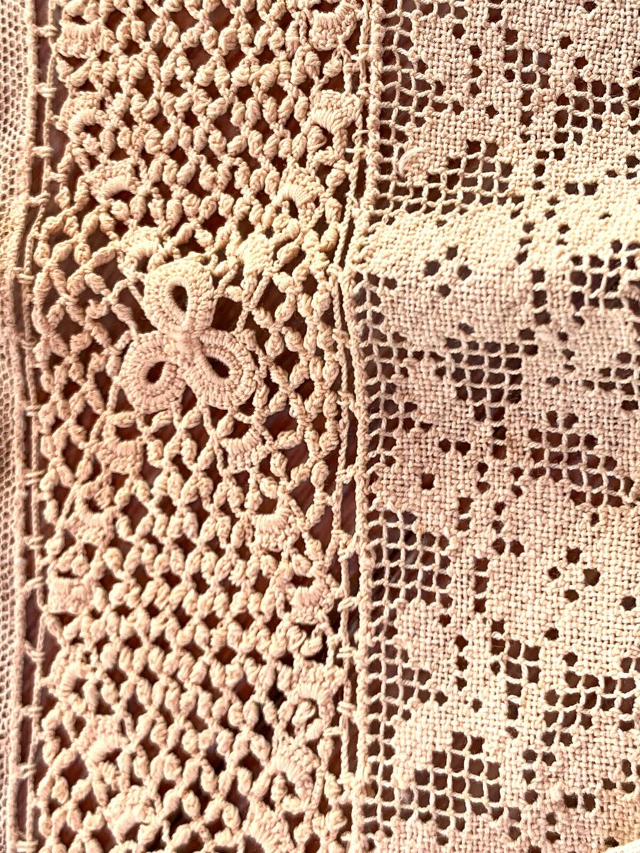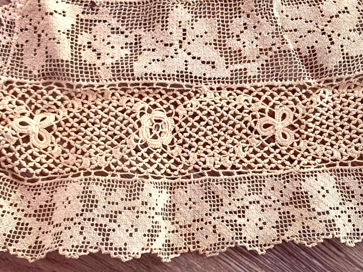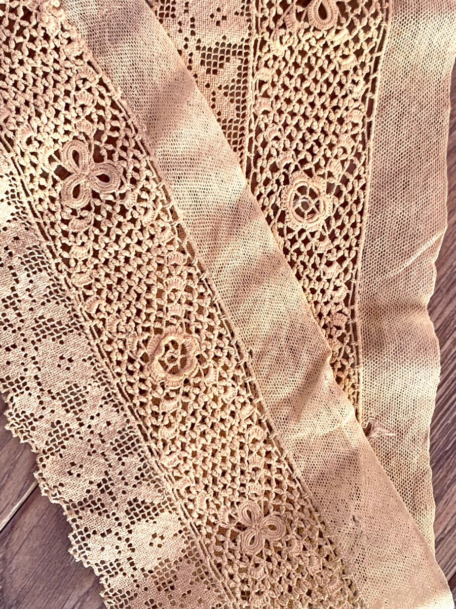 An attractive Edwardian Irish crochet lace collar with an abundance of Irish Crochet and lace. Length measures 42" .4" wide at widest. Excellent condition( except for a couple small holes in the netting edge as shown) and finished on all edges.