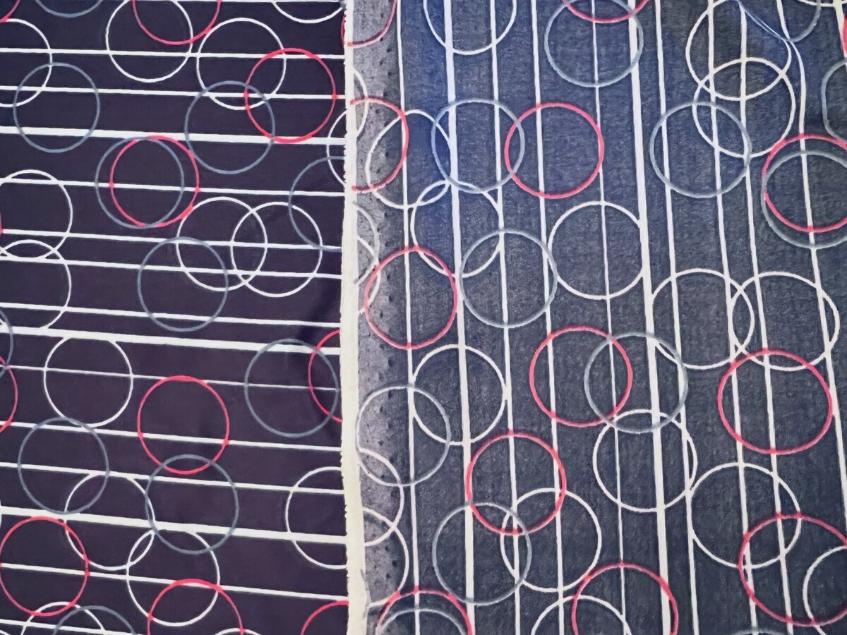 1970s Mod VTG Polyester Knit Fabric Red White Blue - 84Lx65W" Unused Yardage with circles or bubbles on stripes.