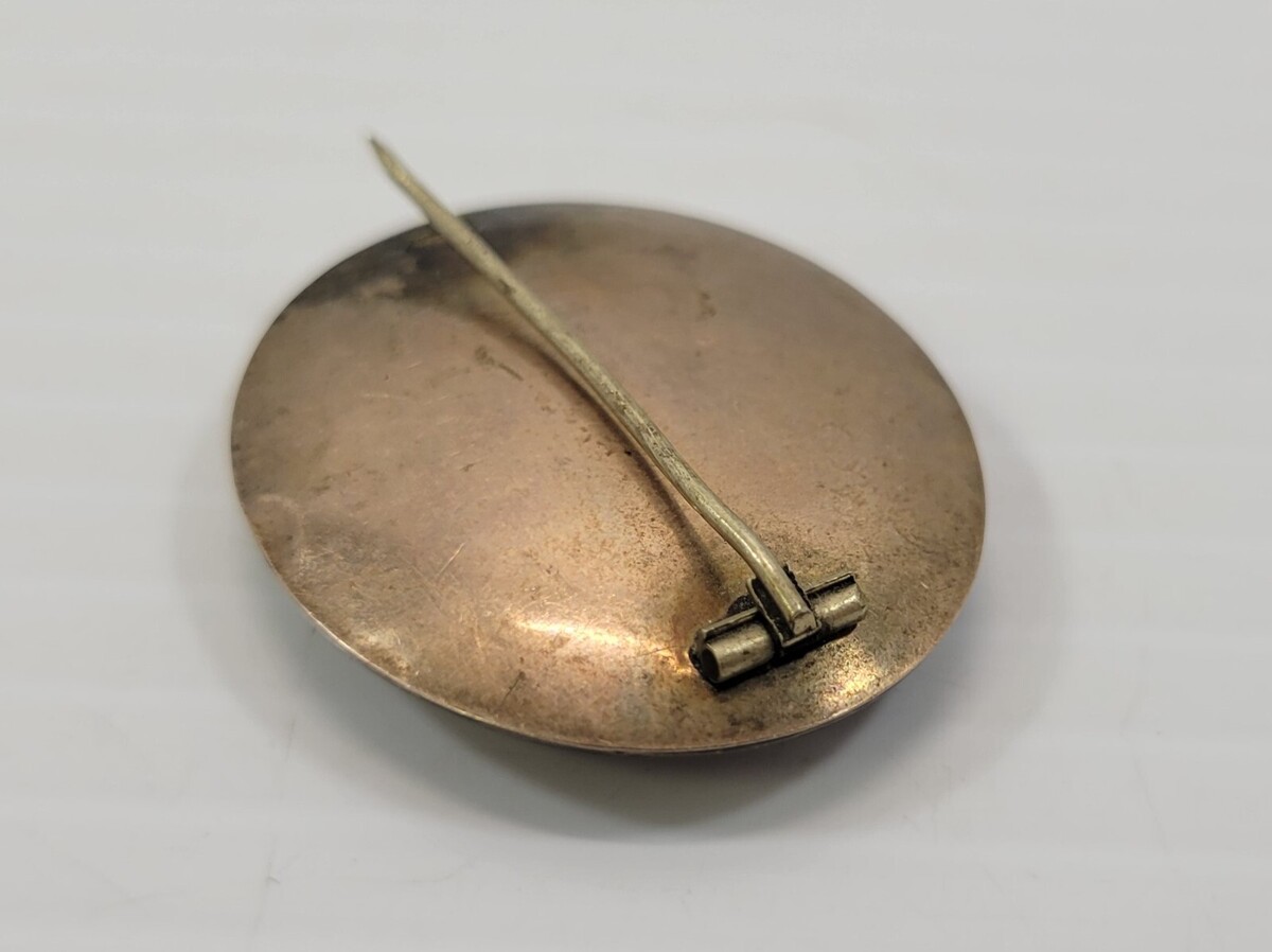 Pin is in vintage condition with some signs of age including some tarnish, marks, scratches and slight dings to the metal. The pin is still intact although a bit wavy. Glass is not chipped or cracked.