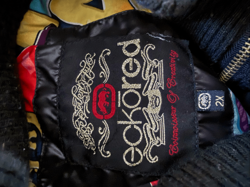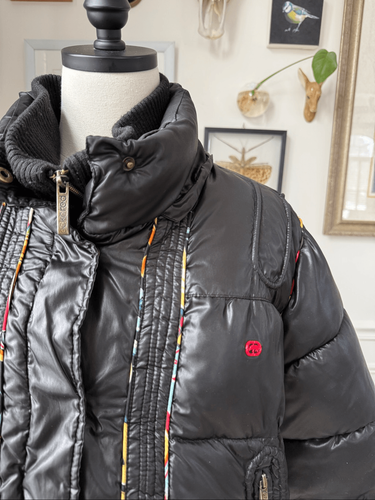 Vintage Y2K does the 70s with this Ecko Red glossy black puffer coats with 5 inch ribbed knit waistband and cuff. Multicolor piping that coordinates with the graffiti print lining. Double layered closure with the black ribbed knit lining being full zip with the glossy black nylon puffer outer fastening with hidden snaps. Zip pockets. All zipper pulls are stamped with branding, and there is a metal brand tab at the chest. So nice to find Y2K style and plus sizing! The fit is very 70s with that wide band stretchy but tapered waist with the puffy upper. 24 inch measurement shoulder to hem and 23 inches armpit to armpit.
