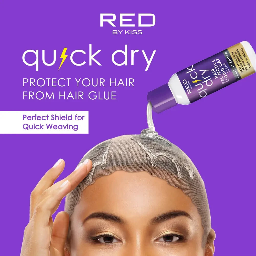 Red by Kiss Quick Dry Hair Protective Liquid Cap is the easiest and most effective shield to protect natural hair and scalp from glue while quick weaving. Spreadable, thin formula enriched with tea tree and keratin works quickly on natural hair or wig caps.?
