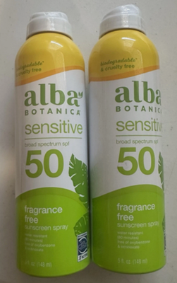 2 Pack Expiration Date of 10/2026 ? SPF 50 SUN PROTECTION: Recommended by the Skin Cancer Foundation, this water-resistant, broad-spectrum sunscreen helps shield the skin from harmful UV rays ? BEACH ESSENTIAL: Made with 100% vegetarian ingredients and botanicals, our biodegradable SPF 50 formula offers sun protection your skin will love ? FRAGRANCE-FREE SUNSCREEN: A lightweight and quick-drying sunscreen spray featuring ingredients like aloe vera, chamomile, and avocado oil ? DISCOVER ALBA BOTANICA SUN CARE: Build out your sun care collection with Alba Botanica's complete line of sunscreen sprays, sunscreen lotions, mineral-based sunscreens, and after-sun products ? SUNSCREEN SPRAY FOR SENSITIVE SKIN: Includes one 5 fl. oz. bottle of Alba Botanica Sensitive Fragrance-Free Sunscreen Spray, SPF 50