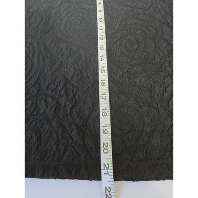 DStudio Petite black pencil skirt features a unique textured matelasse fabric with a large-scale swirling rose floral pattern. This versatile piece offers a sophisticated silhouette with a comfortable elastic waistband and a straight hem. The rich texture adds depth to the classic black color, making it an ideal choice for office wear or evening events.