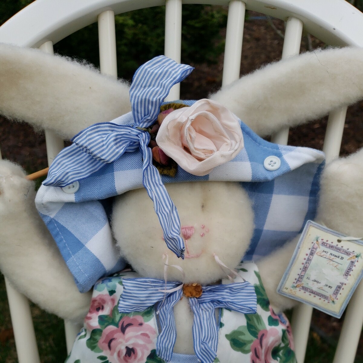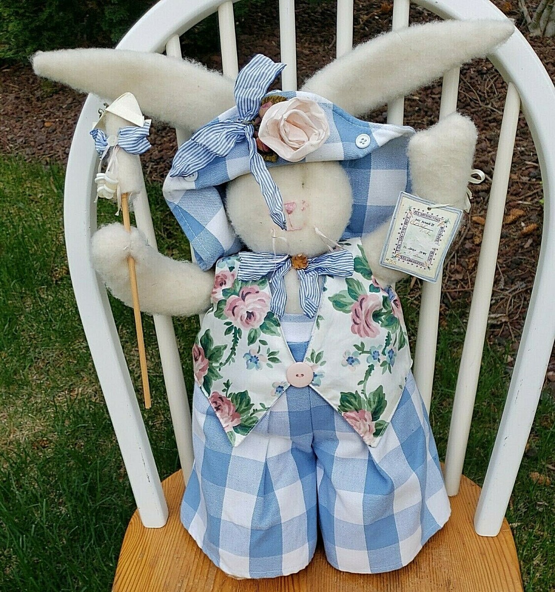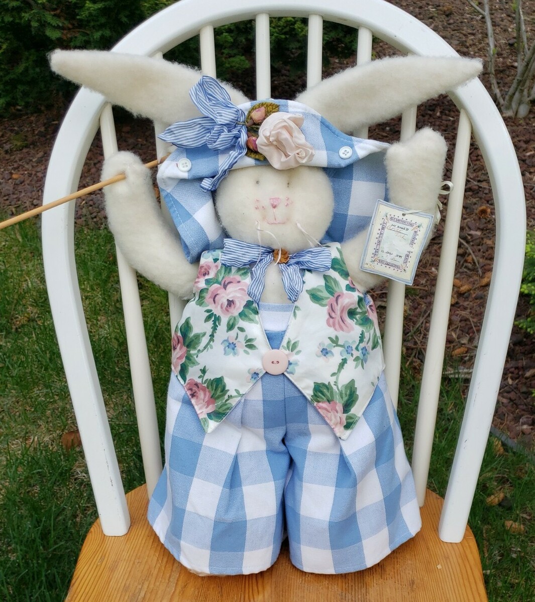 This darling BOY! bunny measures about 22" in height, including the ears. He wears gingham overalls and a floral vest with a matching gingham hat and striped ribbon bows. He looks like he's ready to be in an Easter Parade!