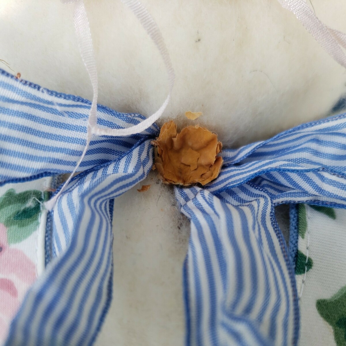 Displayed, but not played with, in good condition. Decorative roses have completely dried up, the one at the collar has crumbled, spreading a bit of the foliage and seeds, but cleaned up as well as I can without tearing at the felted body. Traveling will most likely crumble a bit more and I will cushion them as best I can. Paper doll hat and hang tag show mild creasing and wear