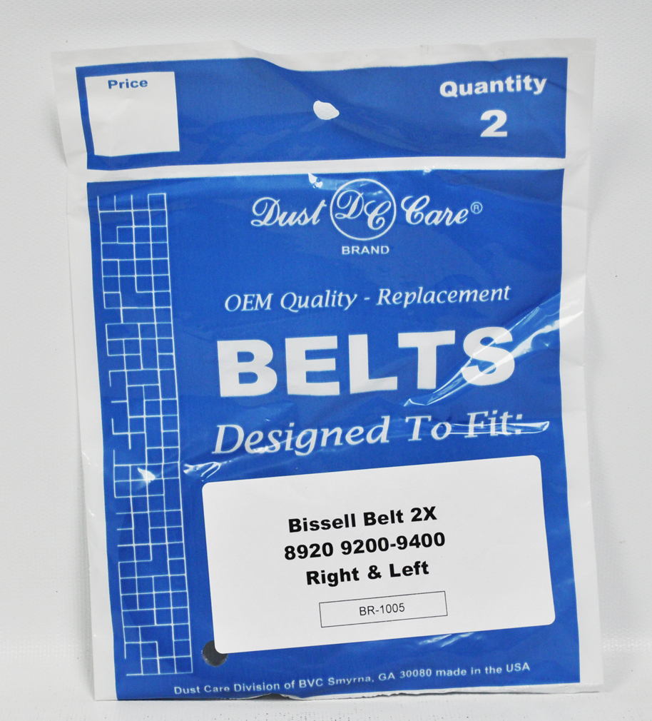 Dust Care Bissell 8920 9200-9400 Replacement Belts. Right and Left Side Belts. 2 Geared Belts in Package. Designed to Fit: Bissell 8920 and 9200-9400. Dust Care OEM Quality Replacement Belts. Manufacturer Part No.: BR-1005 BR-1005