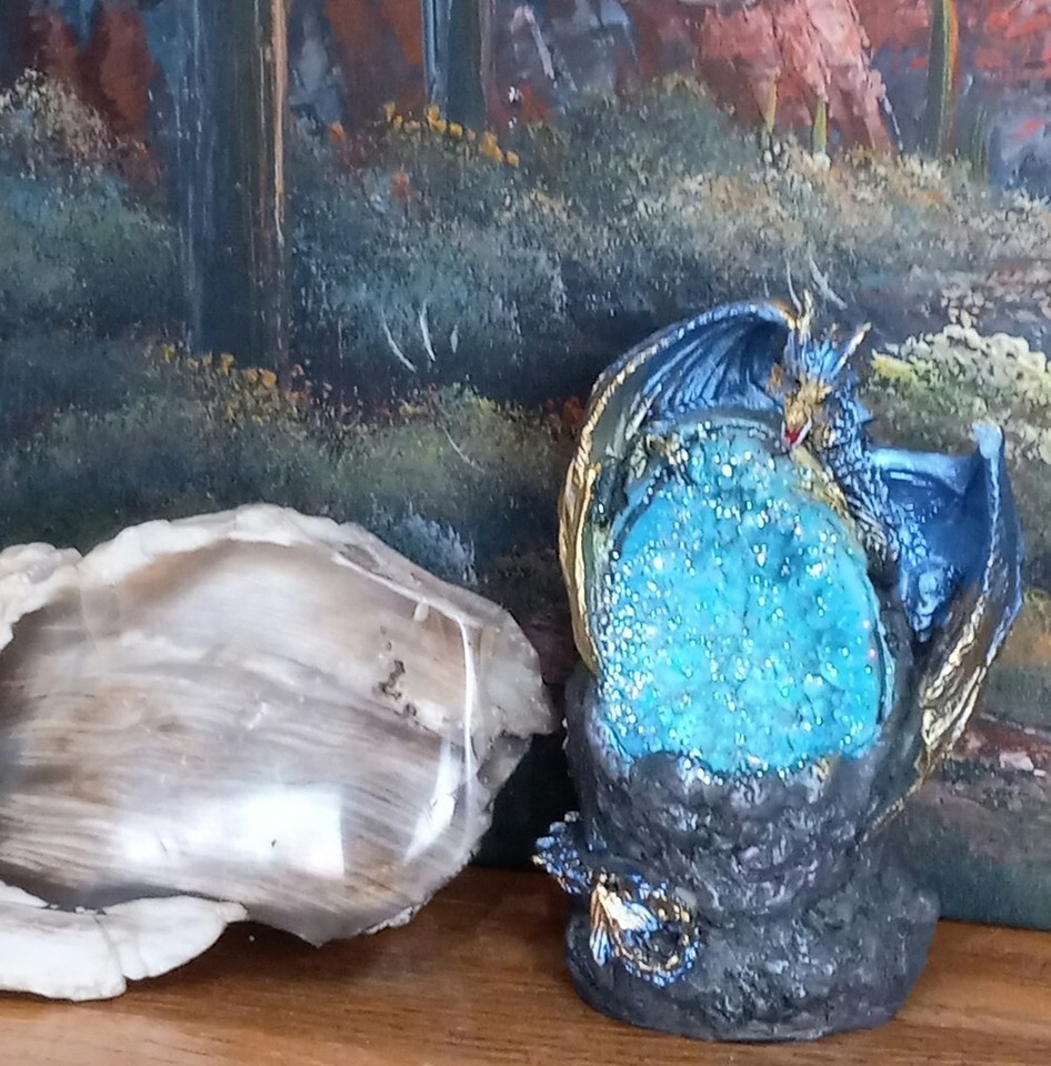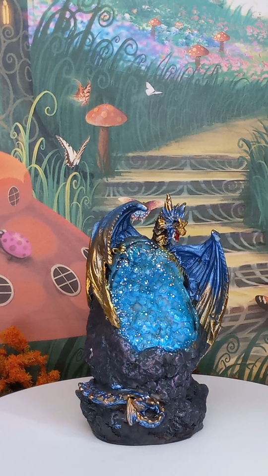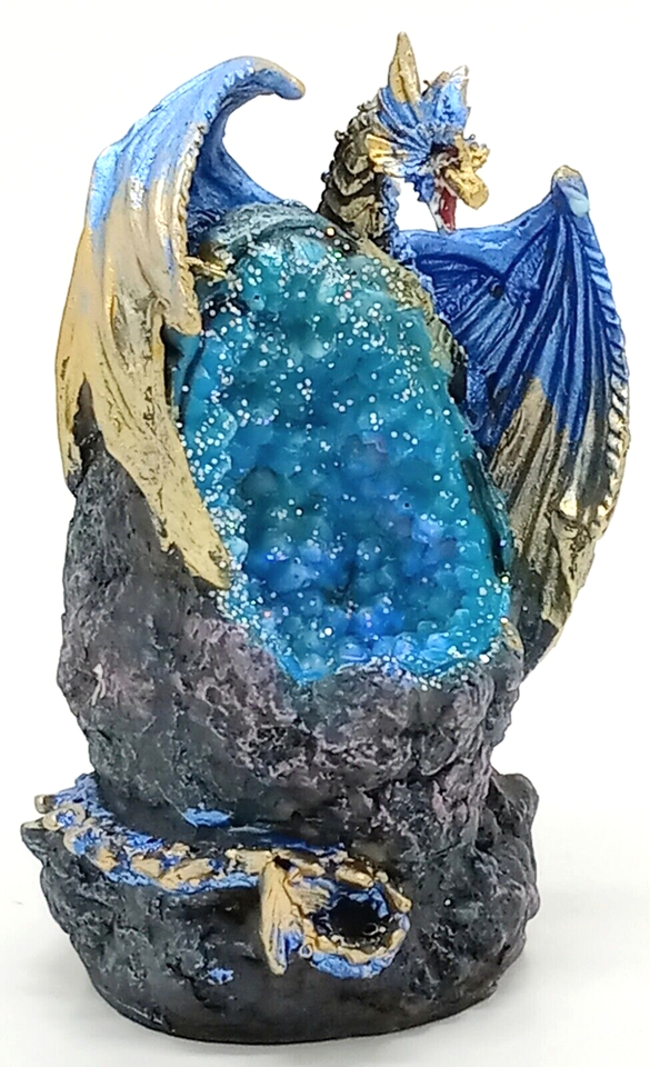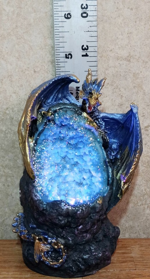 Purple & Gold Dragon Figurine on a LED Resin Crystal Geode Height 4.75in