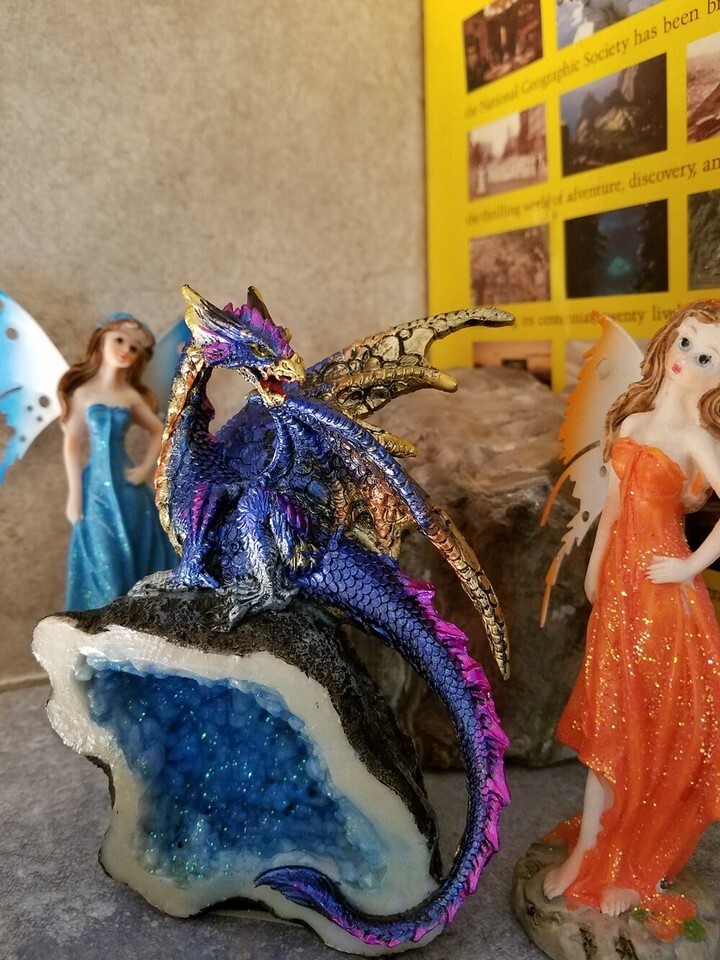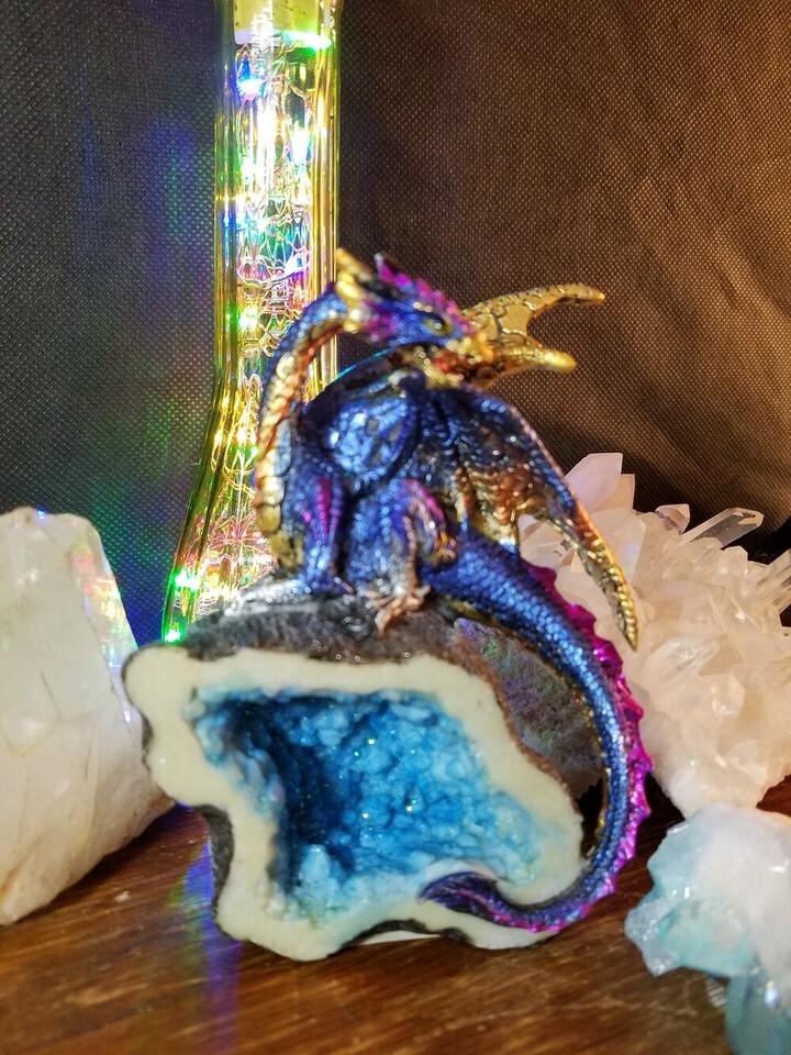 Blue Multi Color Dragon Figurine on a Resin Crystal Geode 5.25" High, 71806