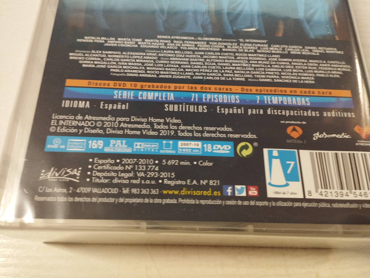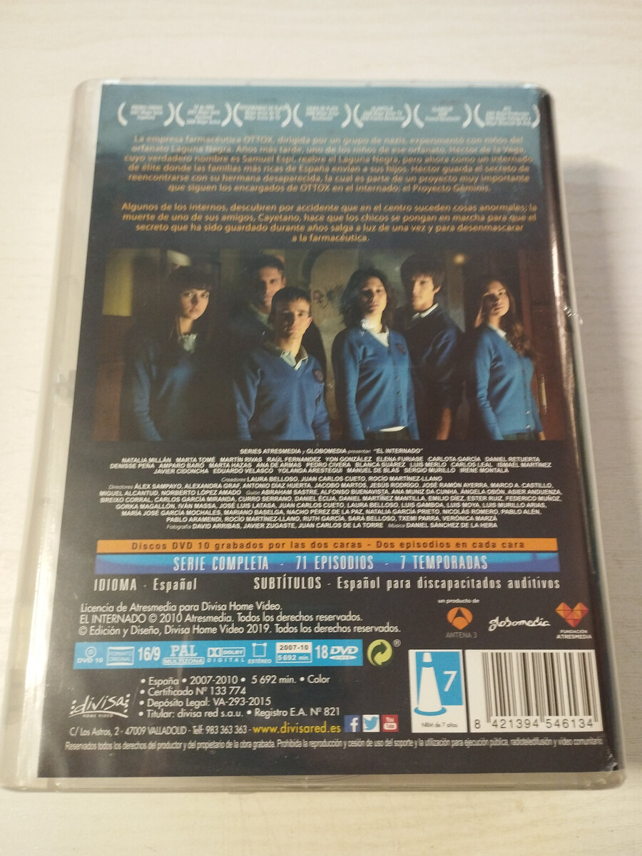 Complete edition de elinternado Black Lagoon, ade the most iconic seriesde Spanish television. This pack brings together the entire 7 seasons, con 71 episodes full de mystery, drama, scientific conspiracies andun unforgettable cast. The plot follows los students and teachers delinternado Laguna Negra, place where yearsdesecretos linked to the pharmaceutical company OTTOX are beginning to come to light. un television thriller full de tension, twists and grandesmomentosque marked an era and conquered millionsde spectators. Complete DVD edition of el internado Laguna Negra, one of the most acclaimed Spanish mystery TV series. This pack includes all 7 seasons and 71 episodes, presented on 18 double?sided DVDs and 10 discs. Audio in Spanish with optional Spanish subtitles for the hearing impair