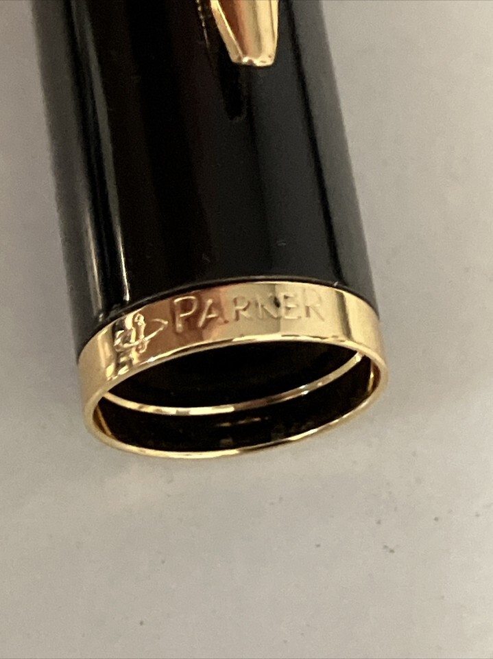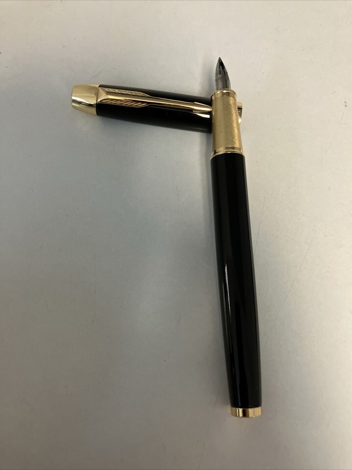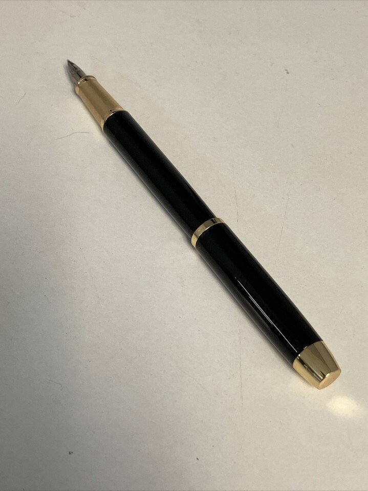 Parker Fountain Pen Black Lacquer Gold Trim Fine Nib IIIQ + Quick Ink Cartridges