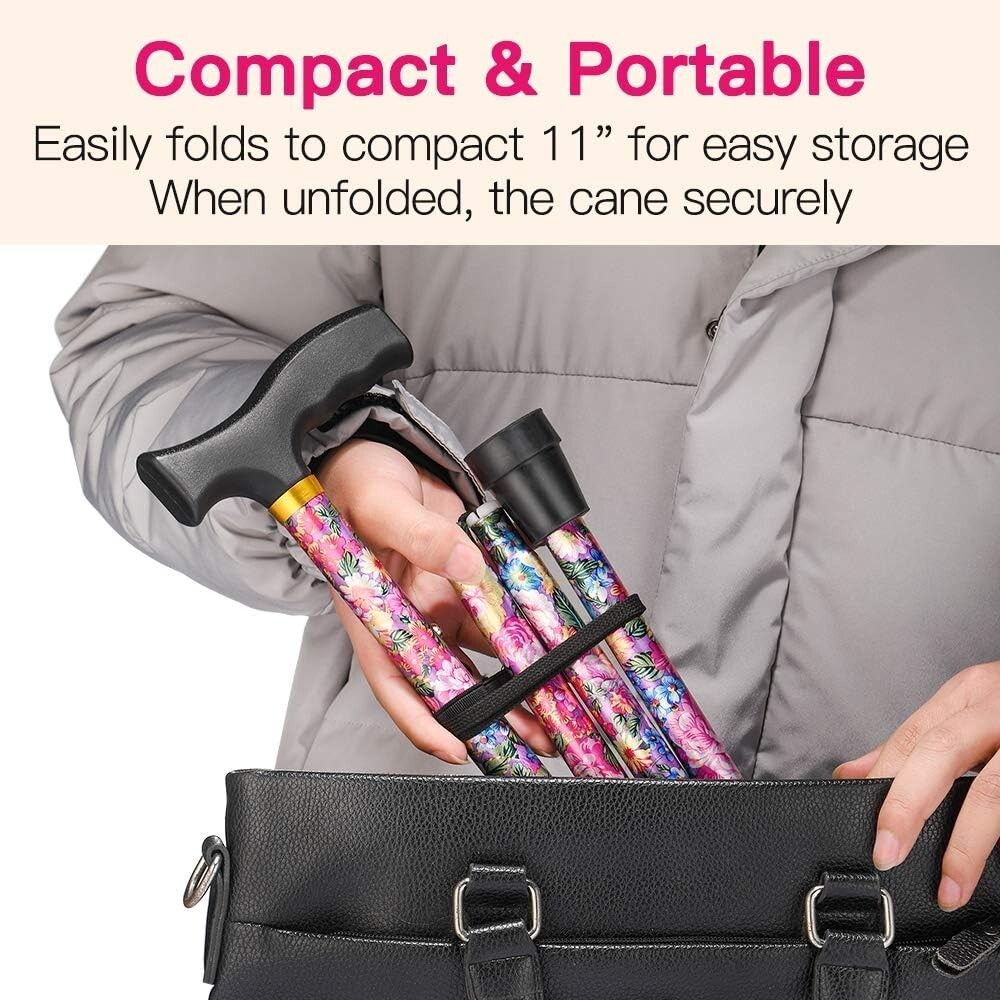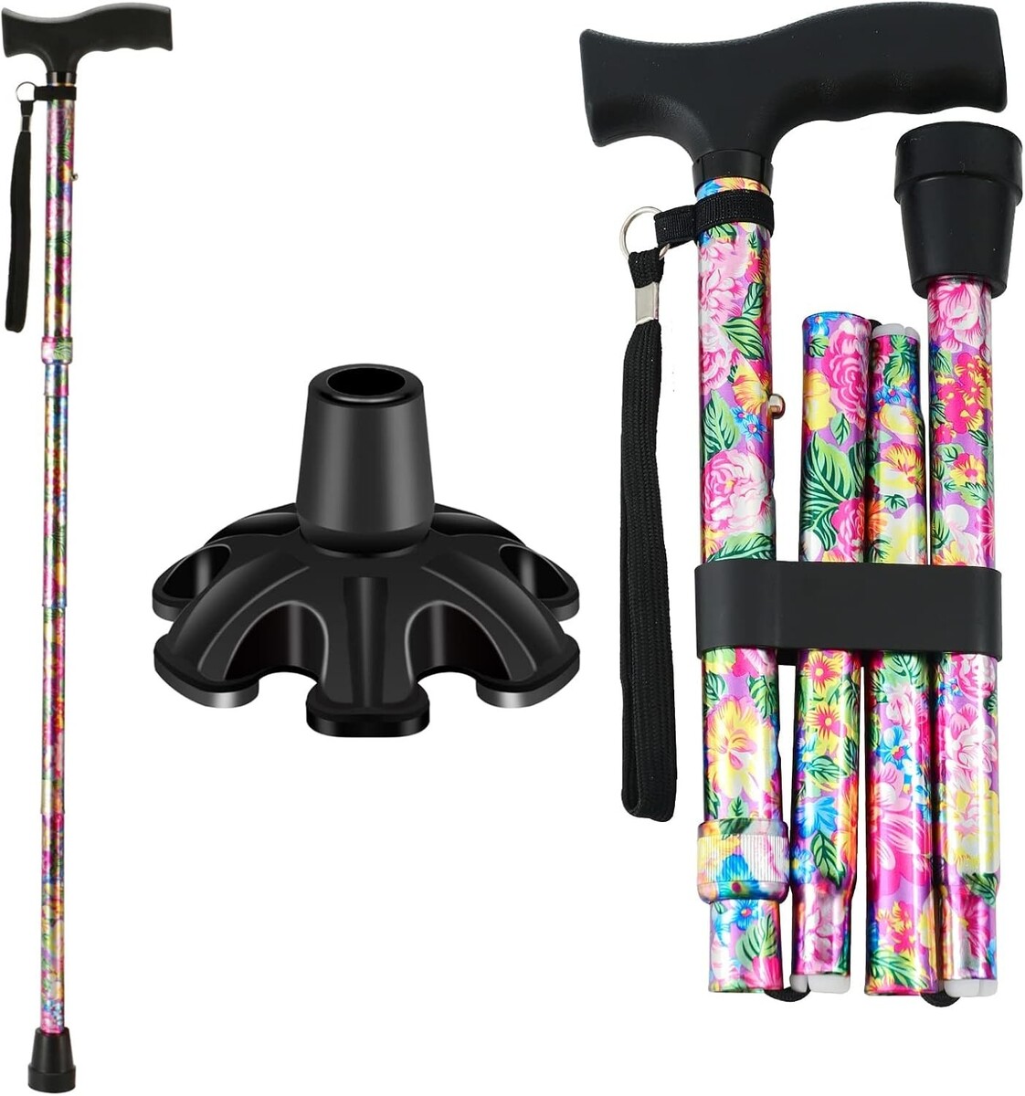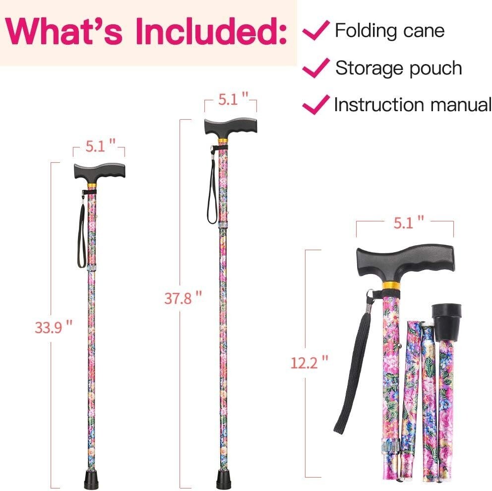 Features: Adjustable Height,Foldable,Lightweight,5-Level Height Adjustable,Comfortable T--Handle,Removable Wrist Strap,Non-Slip Base,Collapsible Design