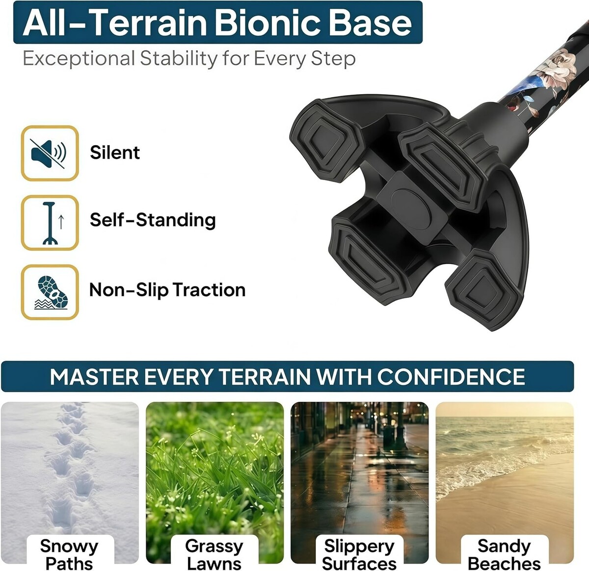 Self-Standing Rubber Base: Equipped with a non-slip rubber base, this cane confidently stands on its own, eliminating the need to bend over to retrieve a fallen walking stick, adding convenience to your daily life.