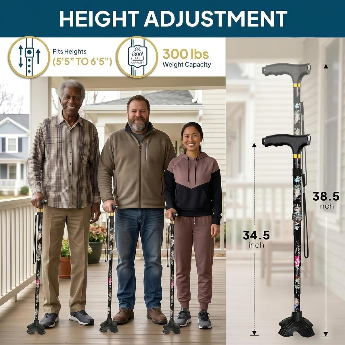 5-Level Height Adjustment: This walking cane offers 5 adjustable height settings (33.8" to 37.8"), perfectly fitting users between 5' and 6'5". It adapts to various needs, whether for daily use or for those seeking reliable support.