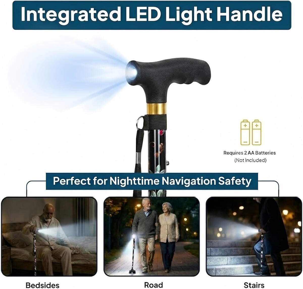 Built-In Light for Low-Light Safety: The walking cane features a side knob?twist counterclockwise to open, insert 2 AA batteries (not included), then twist clockwise to secure. A simple press turns the light on/off, ensuring you safely navigate dim areas.
