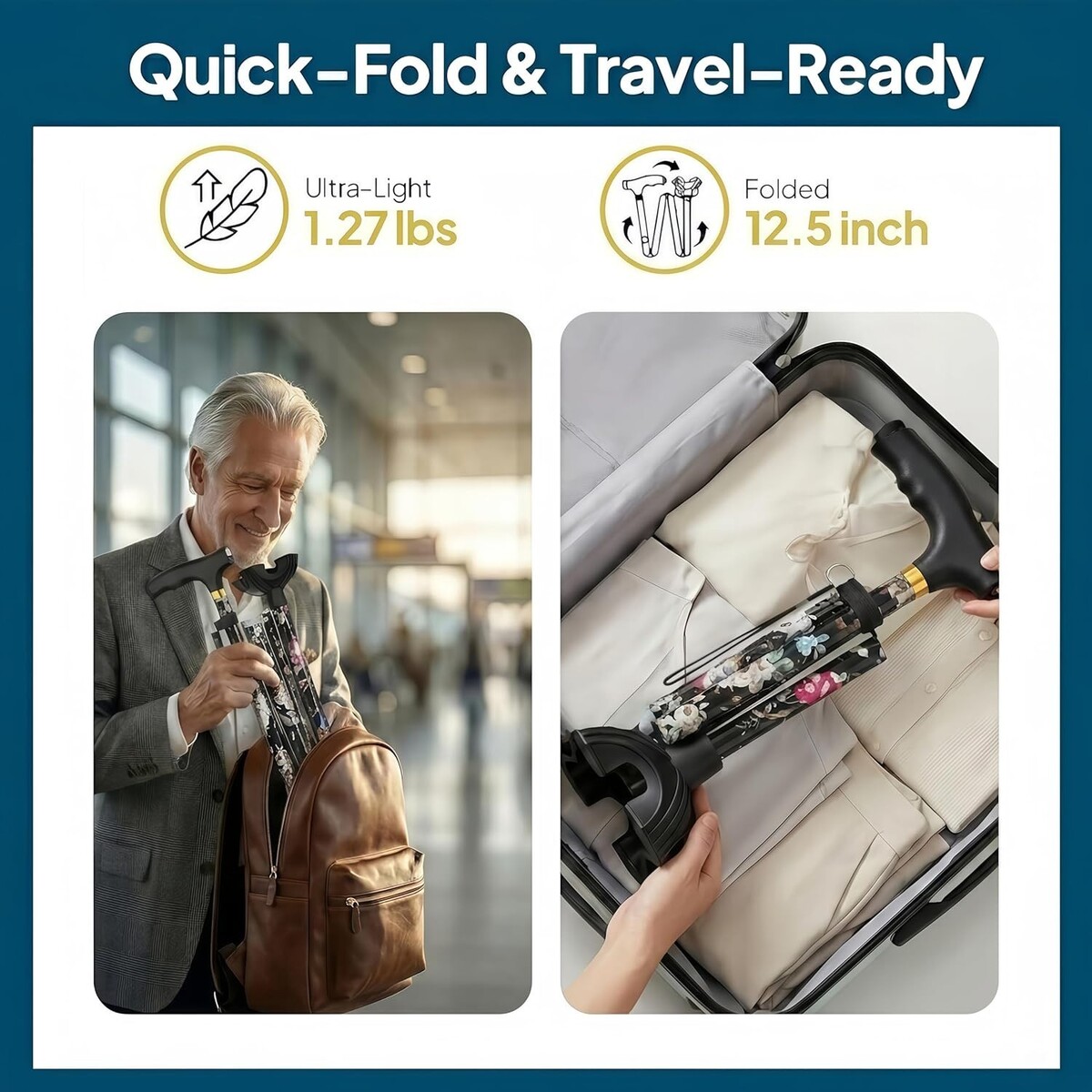 Foldable Portable Design: This innovative folding cane collapses to just 11 inches, perfect for travel or daily outings, fitting easily into bags.