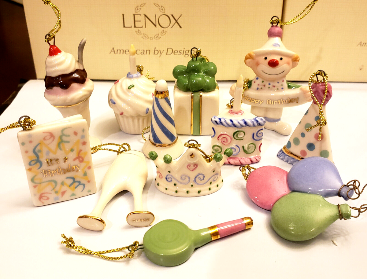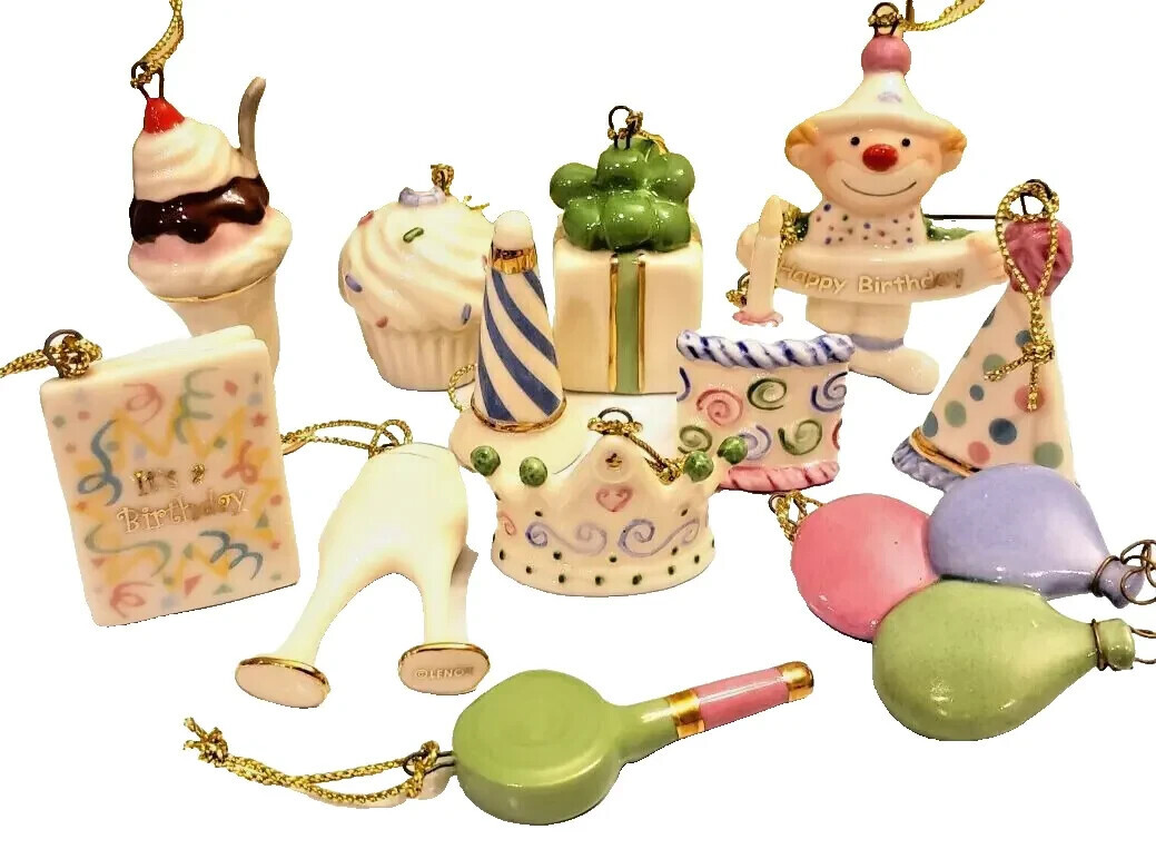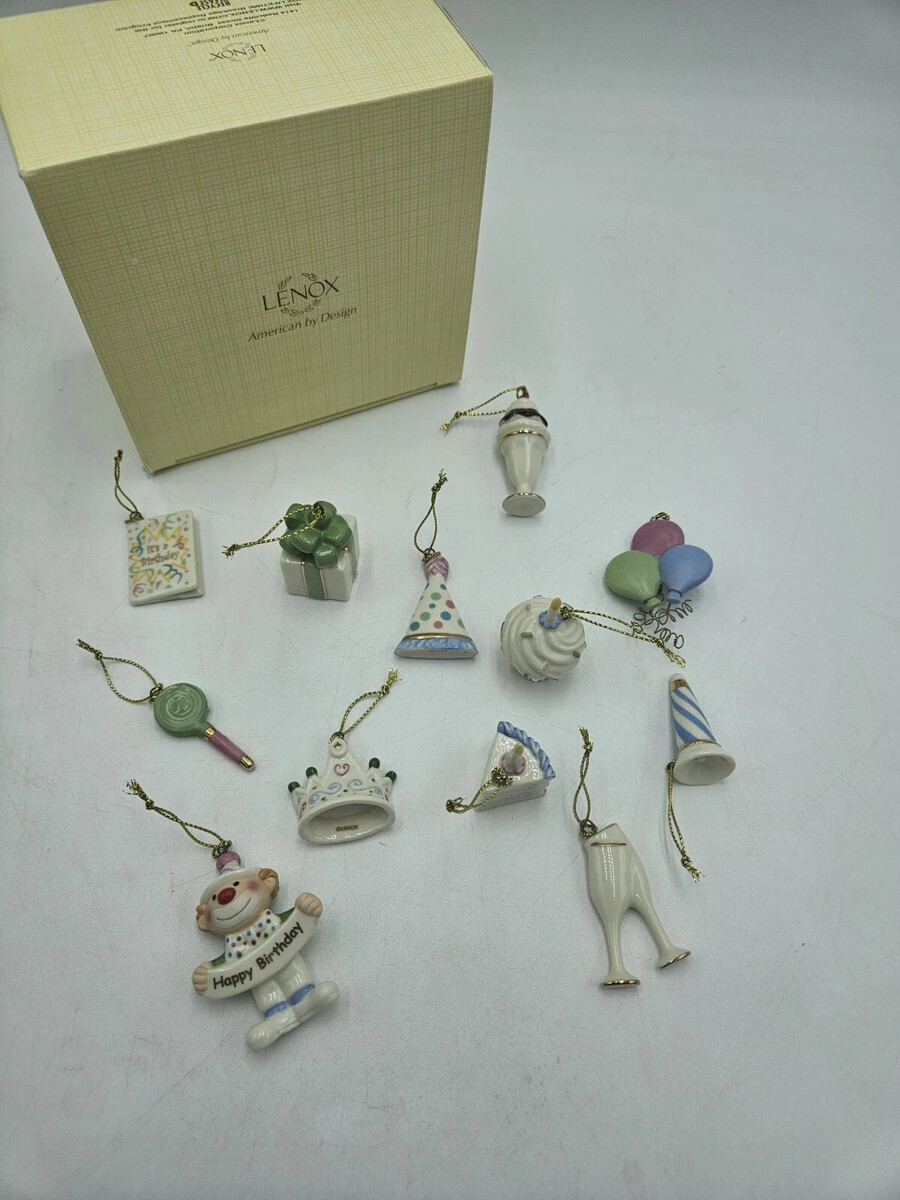 Lenox Happy Birthday Miniature Tree Ornaments 12 Crown Cake Clown Balloons NEW
