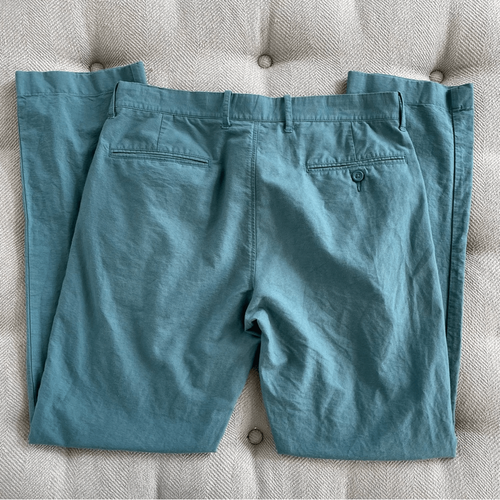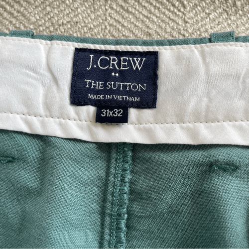 J Crew The Sutton 100% cotton flat front straight leg chino pants with hip and back welt pockets. Tag size 31 x 32, however I measured the inseam and it is actually 31 inches. 10 inch rise and 16 inches straight across the Waist. Button and zip Closure.