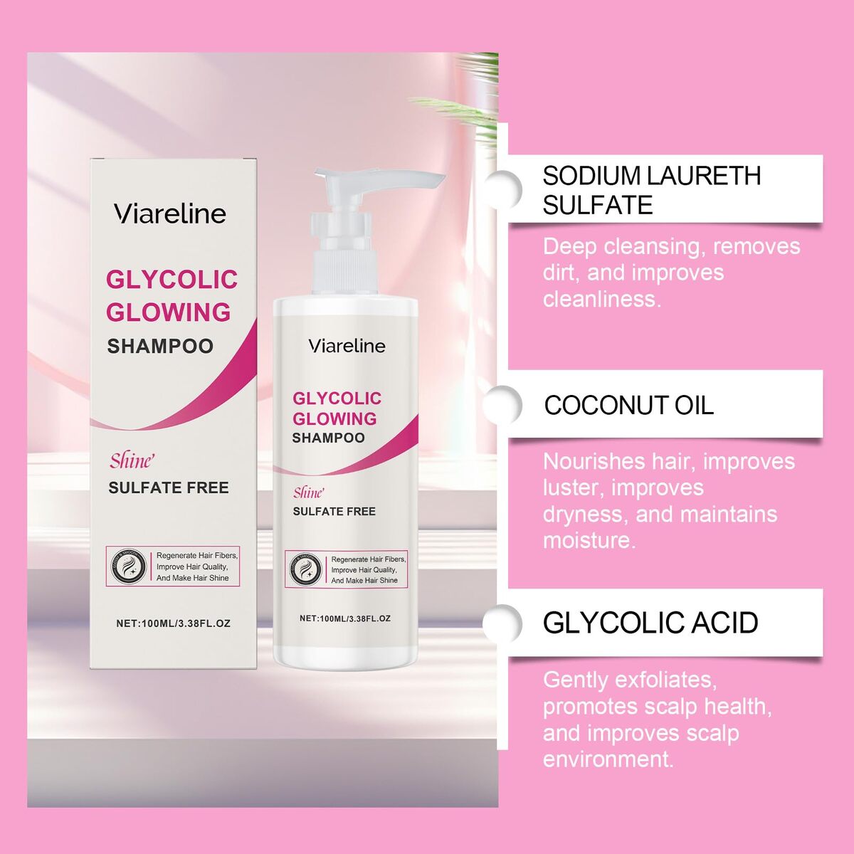 Short product description: Viareline Glycolic Glowing Shampoo is a gentle, lightweight cleansing formula designed to leave hair feeling clean, soft, and manageable. Enriched with coconut oil and glycolic acid, it helps maintain smoothness and natural-looking shine while keeping hair refreshed. The mild formula spreads easily through hair, rinses clean, and is suitable for daily use. Packaged in a convenient 100ml (3.38 fl oz) bottle, this shampoo is ideal for everyday hair care at home, at the gym, or while traveling.