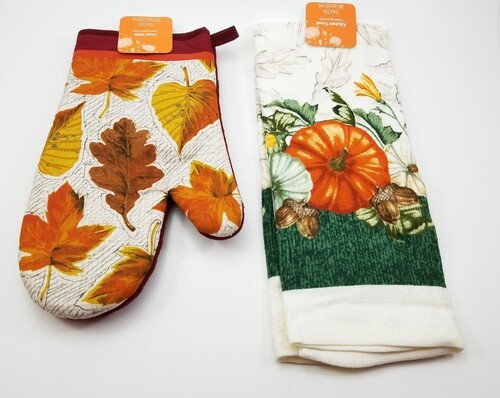 Kitchen Oven Mit & Dish Towel w/ Pumkims Set Fall Autumn Leaves New