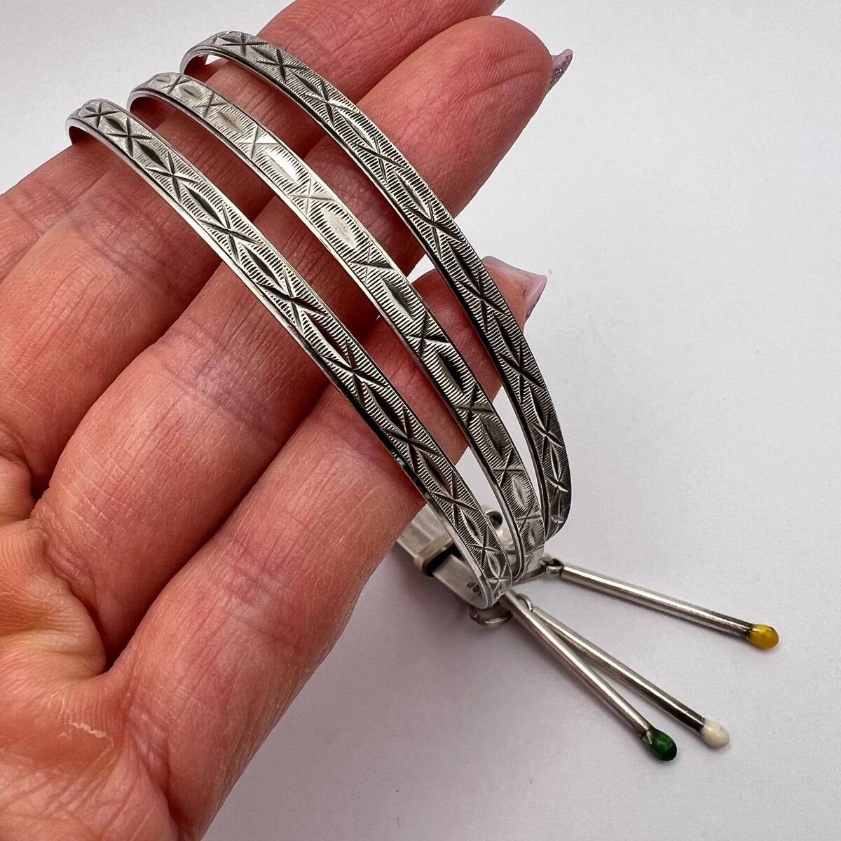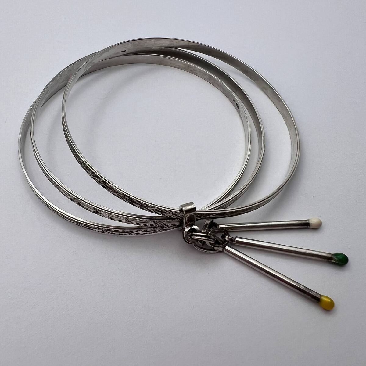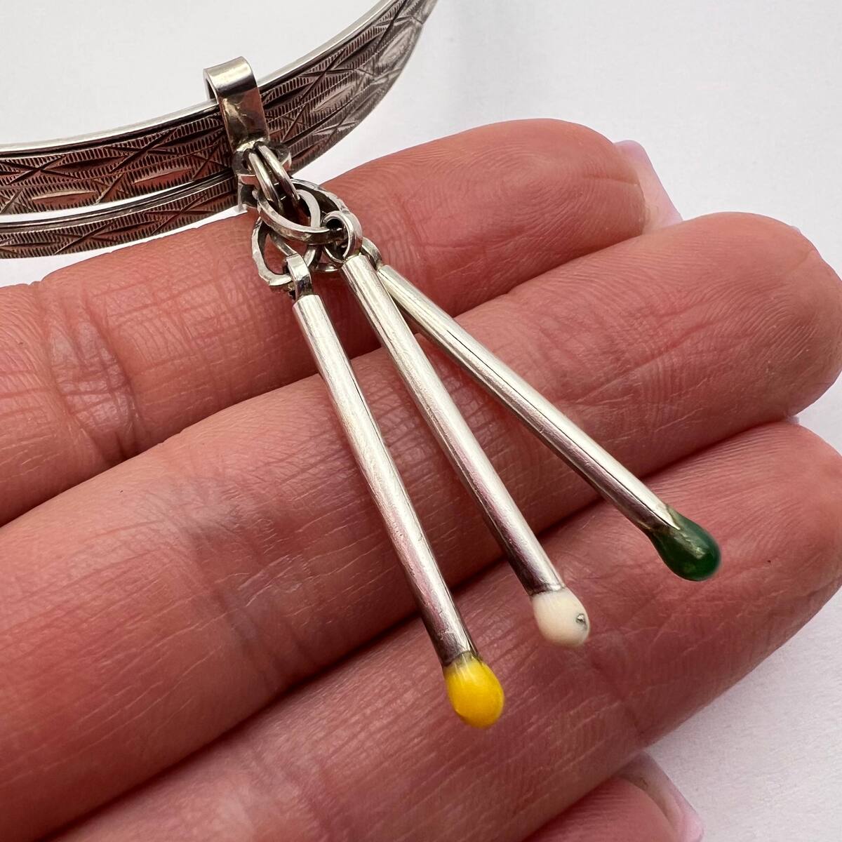This unique vintage bracelet is a beautiful example of mid-20th century European silver craftsmanship. Made of solid 800 silver, the piece features three elegant engraved bands connected together, each decorated with an intricate hand-chased geometric pattern. Attached to the bracelet are three playful dangling charms shaped like miniature matchsticks, each topped with colored enamel ?match heads? in yellow, green, and white.