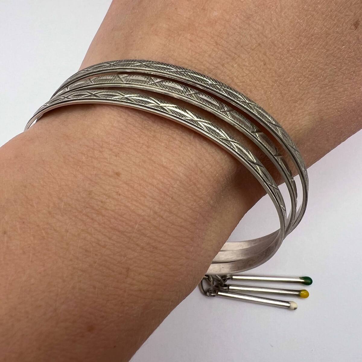 Vintage 800 Silver Triple-Band Bracelet with Matchstick Charms ? Mid-20th Century European Jewelry