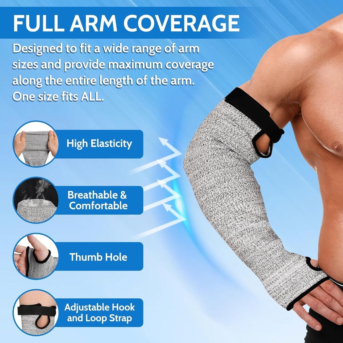 One-Size-Fits-All Design: Featuring a versatile design with thumb holes and an adjustable hook and loop closure, these sleeves guarantee a snug and secure fit for a wide range of arm sizes, making them suitable for everyone, no matter the activity.