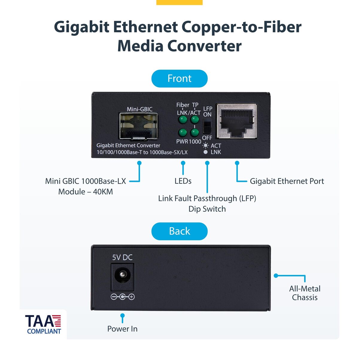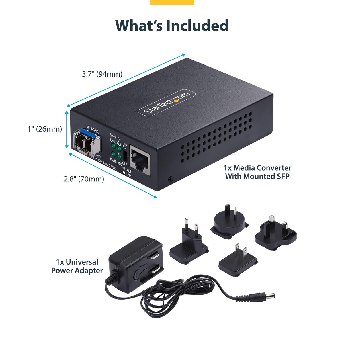 1 Media Converter, 1 Universal Power Adapter, 1 Product Documentation |