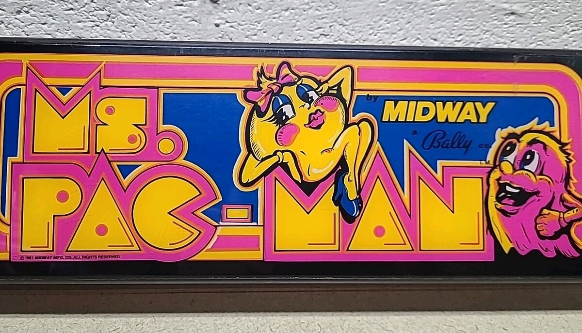 Vintage Ms. Pacman Midway Bally Arcade Game Marquee Sign 1981 Acrylic 18" ร 6"