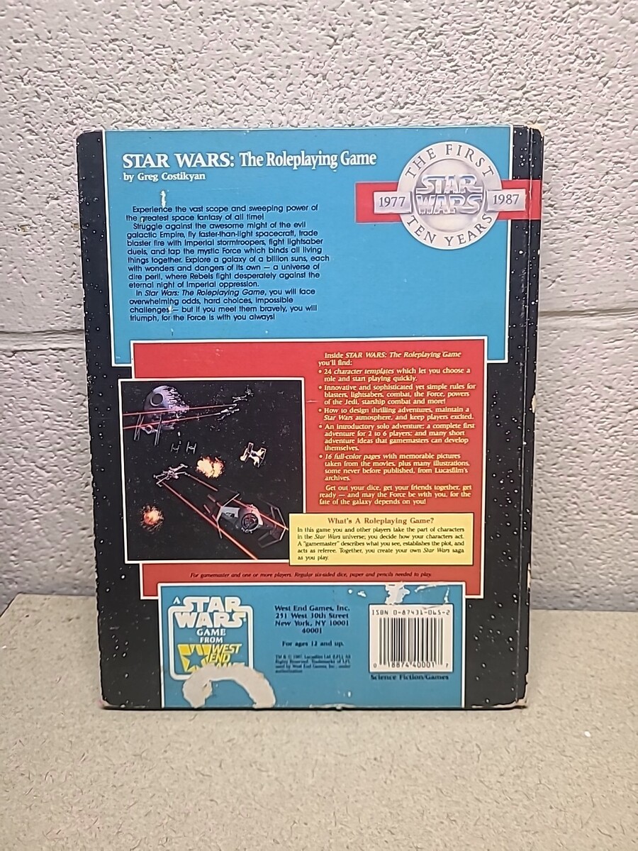 The product is a first edition hardcover copy of "Star Wars: The Roleplaying Game" by Greg Costikyan, published by West End Games in 1987. This book is a collectible item for fans of the Star Wars franchise, offering a unique opportunity to immerse oneself in the iconic universe through roleplaying scenarios. With its special attributes as a first edition, this book holds added value for collectors and enthusiasts alike.