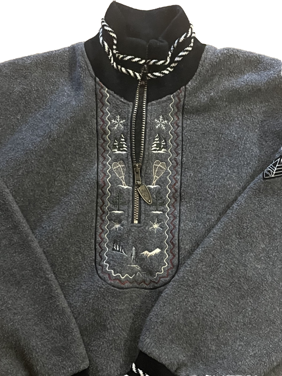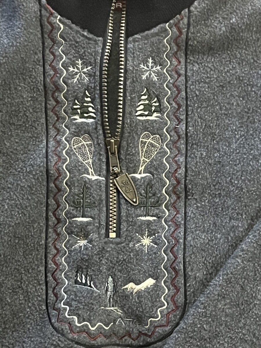 The All Terrain Gear 1/4 Zip Sweater Pullover in Gray is a stylish and versatile piece perfect for outdoor activities in the winter and fall seasons. Made of polyester, this sweater features a pullover style with a collared neckline and long sleeves, making it both comfortable and warm. The embroidered accents and vintage ATG branding add a touch of unique charm, while the 1/4 zip detail allows for easy layering. Ideal for travel, casual wear, or workwear, this sweater combines practicality with a fun winter-themed pattern, making it a must-have for any outdoorsy individual.